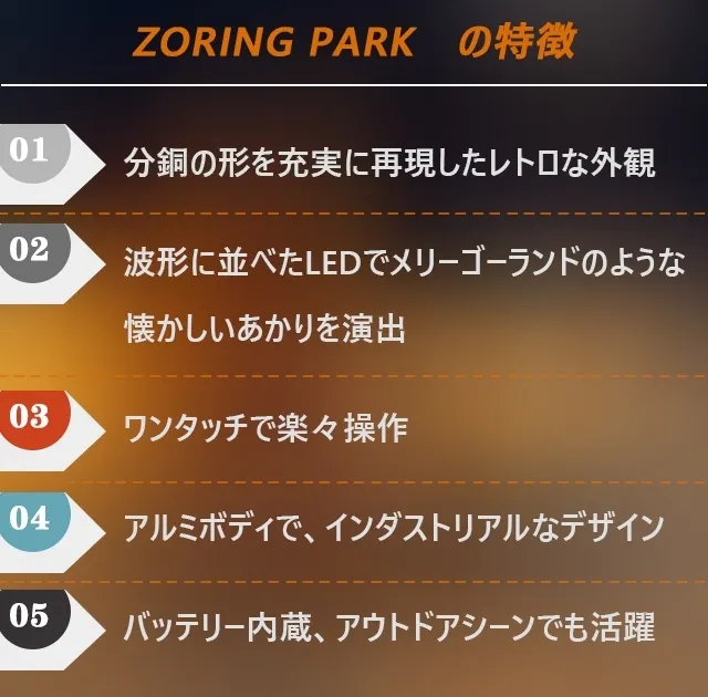 テントや自宅の夜に穏やかな灯を届ける「ZORING PARK」は、