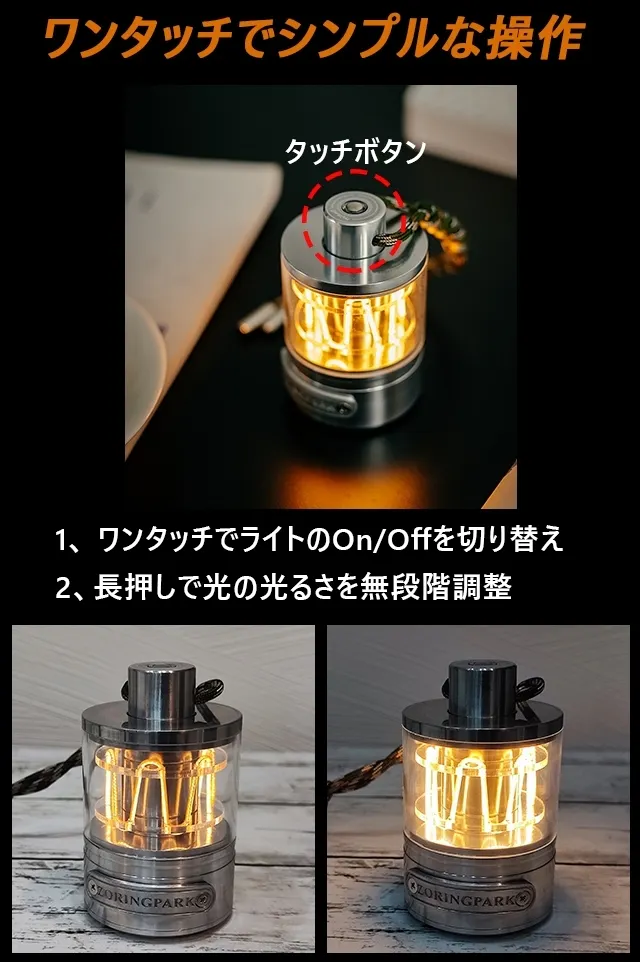 A、ランタンの上部にあるタッチボタンをタッチするとライトが点灯します。もう一回タッチすると、ライトが消灯します。長くタッチすると、明るさを調整できます。