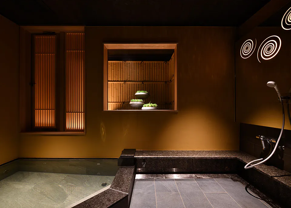 天然香住温泉を源泉とし、モダンな和の空間の中に銀引きで香住の海をイメージしたデザインを取り入れています。同室にあるドライサウナと併せて使って日々の疲れを癒すことができます。