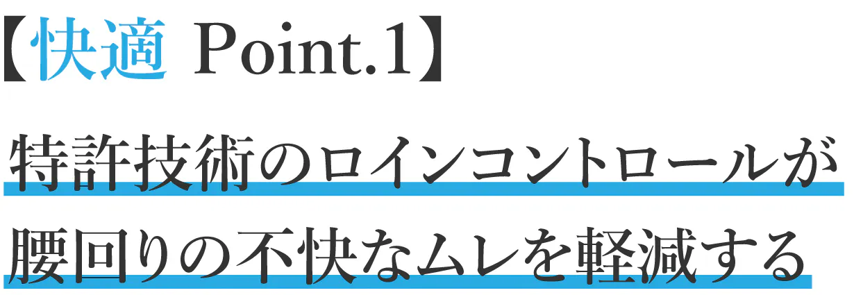 特許仕様のロインコントロール(特許登録番号:4562121号)が腰回りを快適にします!ベルトの裏に吸放湿性のある3Dメッシュを使用し、ベルト表面のパンチングデザインの空気孔より腰回りの嫌なムレを放出しムレを軽減できる通気の良い快適仕様。