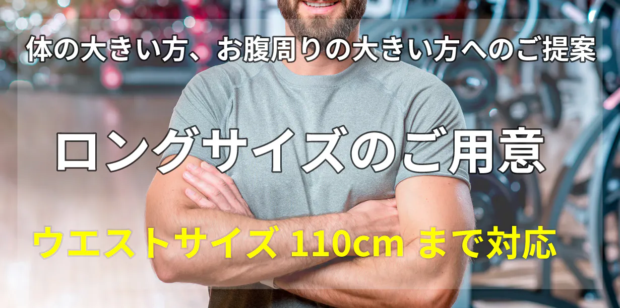 レギュラーサイズでもウエストサイズ95cm対応と長めに設定していますが、95cmでは足りないというお声がありました。本プロジェクトの期間限定で110cm対応サイズをご用意いたします。