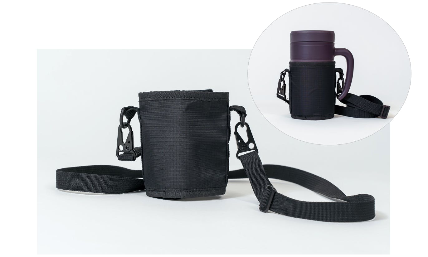 HANDLE TUMBLERには専用ストラップが付属します。表面には切り裂きに強く耐久性が高いリップストップ素材を採用。本体を衝撃から守る高い耐久性と、雨に負けない撥水性、軽さを兼ね備えた屋外でも頼れる仕様です。