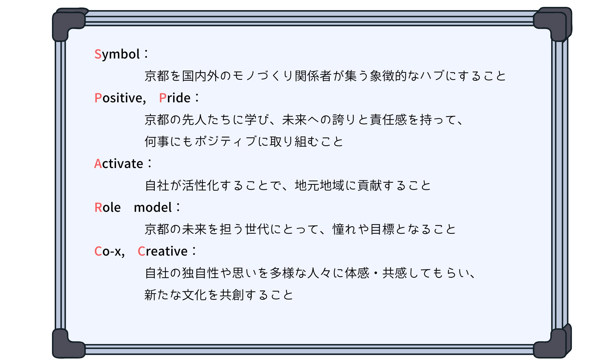 これから私達は次のステージへ進みます。京都の地域の中での交流・学び合いを軸としながら、さらに日本の他の地域、そして世界の人たちと繋がっていきます。世界が求める知恵や文化、美意識を一緒に世界の人たちへ伝え、交わり、切磋琢磨しあいながら、新たな「MADE IN KYOTO」を創り、新たな時代を共に切り開いて行きましょう!