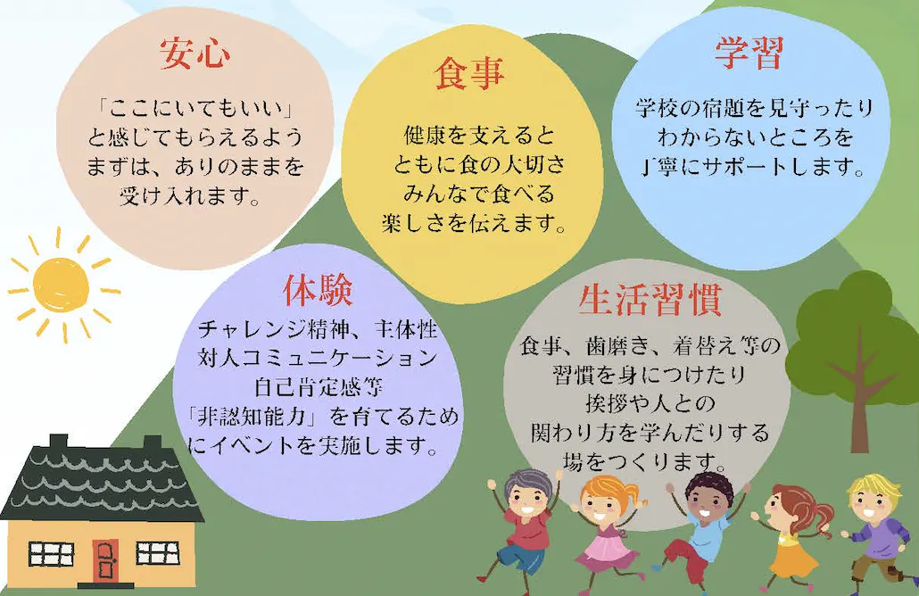 「にじいろはうす」は、学びにくさや⽣きづらさを感じる子ども達が多い現代において、学びの場・交流の場の提供を通じて⼦どもと その親を⽀援することの重要性がましている。そこで、子ども達⼀⼈ひとりが⾃分らしさという⾊を持ち、地域⽣活の質の向上に向けた「⼼地よい居場所」の中で、⽣きがいを探し求めて欲しいという趣旨で設⽴された、⾮営利団体です。