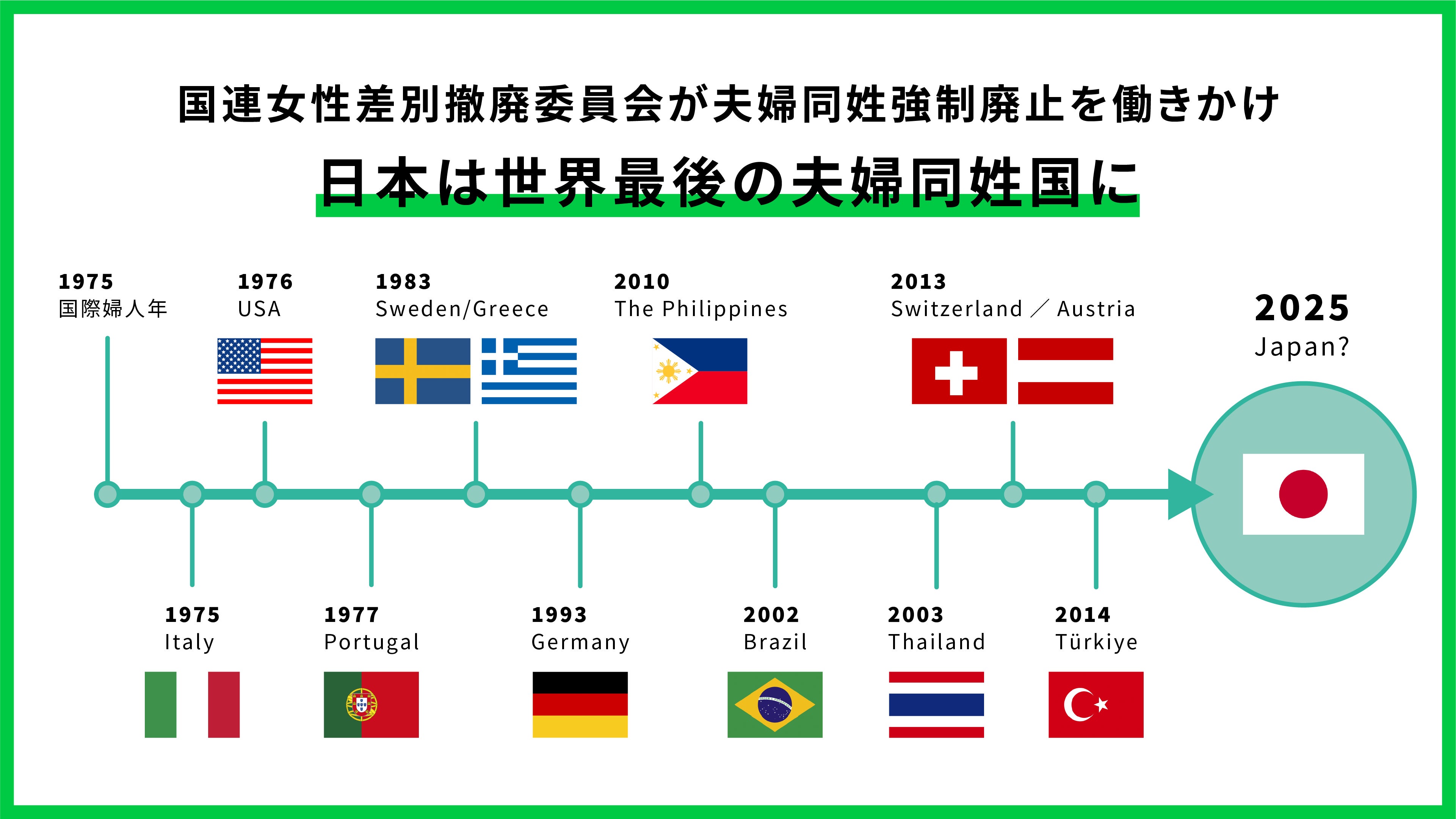 それに応じて夫婦同姓だった国は次々と、お互い改姓しない夫婦別姓も選べる選択制を導入。残すは日本だけとなりました。