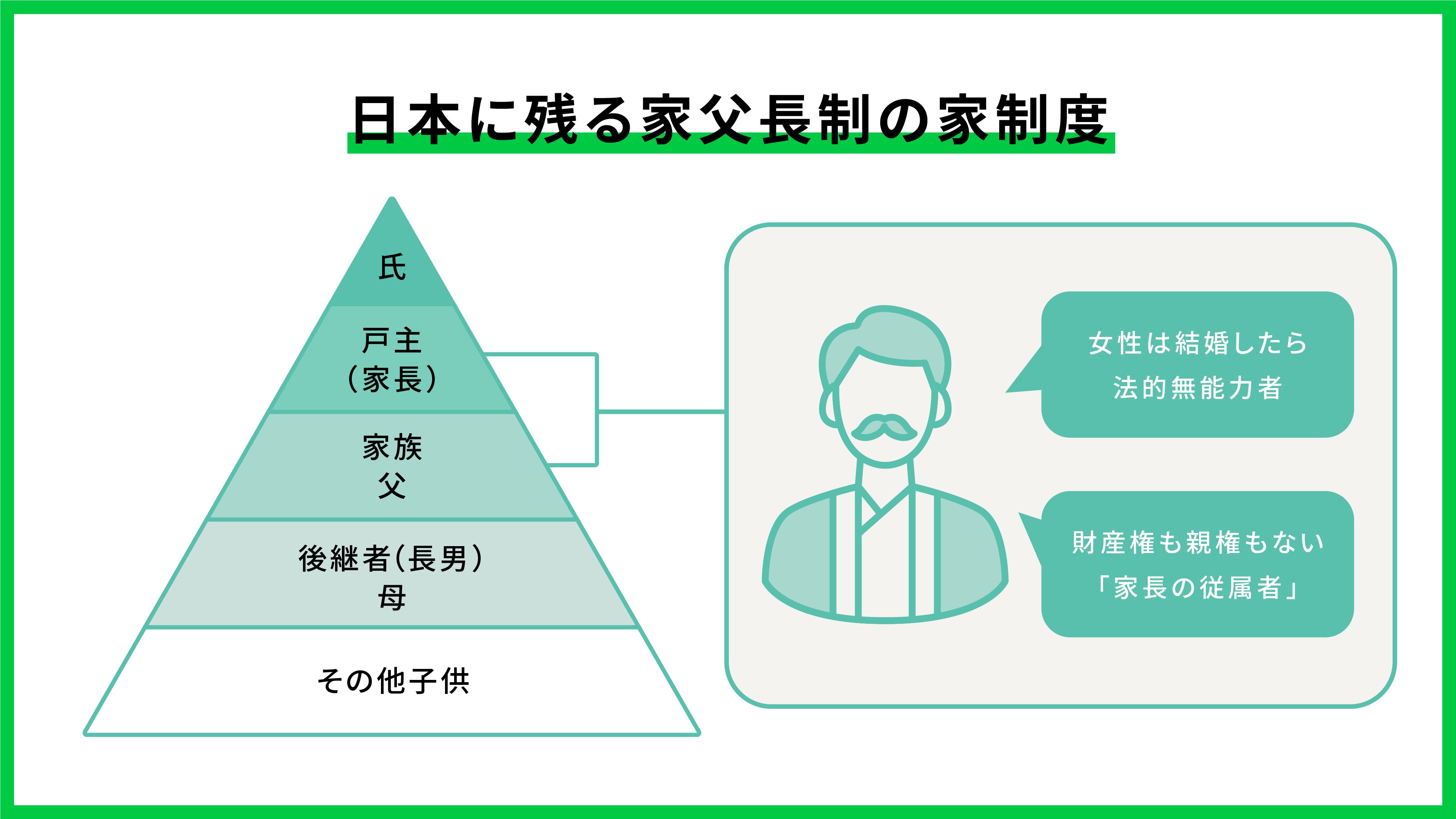 夫婦同姓と同時に日本政府が導入したのが、「家制度」という差別法。NHKの朝ドラ「虎に翼」で描かれているように、家制度によって女性は法的に無能力者となりました。財産を持つ権利も、親権もなし。もちろん参政権はありません。女性が働くことも、夫や夫の父など「家長」の許可制。