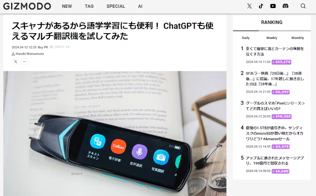 2024/08/27 21:00皆様、こんばんは !Brightチームです。4月12日 、Gizmodoで [NEWYES ChatGPT搭載翻訳ペン] を紹介して頂きました!話題:スキャナがあるから語学学習にも便利! ChatGPTも使えるマルチ翻訳機を試してみた是非下記のリンクからアクセスしてみてください。https://www.gizmodo.jp/2024/04/machi-ya-review-chatgptpen-729829.html【レビューの一部抜粋】〈 ChatGPTもすぐに使えるこちらが「ChatGPT搭載翻訳ペン」。名前にはペンと付いていますが、どちらかと言えばスマホに近い感覚。ディスプレイは視認性も高く、タッチパネルで動作も快適。翻訳モードは複数あり、電子辞書なども搭載しているので語学の勉強にも便利ですね。主には翻訳が仕事ですが、話題のChatGPTも使えるのがポイント。翻訳以外にも文章の要約やお店のリサーチなどにも活用できます。もちろん日本語以外の言語で使用することもできるので、英会話レベル上達のために英語で質問してみるのもありですね。1点注意したいのが、ChatGPTを有効化するには月額料金(初月無料、以降月額6ドルまたは3ヶ月12ドル)が必要です。サブスクの解約はいつでも可能なので、必要に応じて使いましょう。以上、Bright DIYチームでした!ご興味のある方、ぜひ支援お願い致します。https://camp-fire.jp/projects/view/729829Brightチームは、当プロジェクトをもっと多くの方に知っていただきたいと考えております。よかったら、SNSでのシェア・拡散をお願い致します。#newyes #brightdiyどうぞよろしくお願い致します。Brightチーム もっと見る