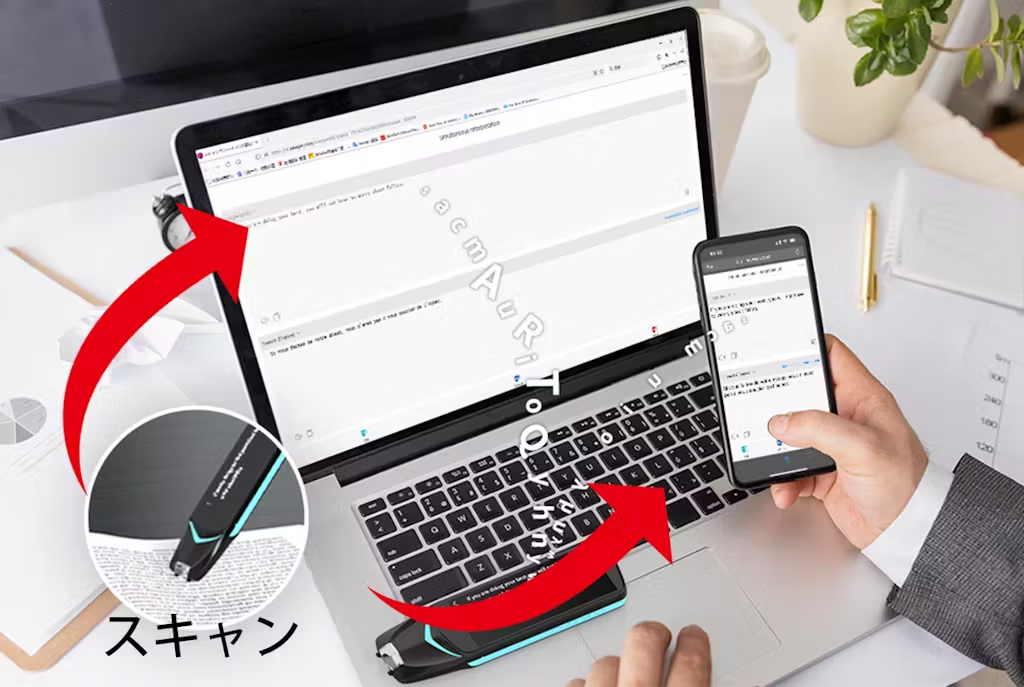 スキャンペンをスライドさせるだけで、瞬時に文字起こししたテキストがPCやスマートフォンの画面に表示。追加のソフトウェアは必要なく、ペンのQRコードをスキャンするだけで、スキャンされたテキストを同時にスマートフォンやPCで表示できます。
