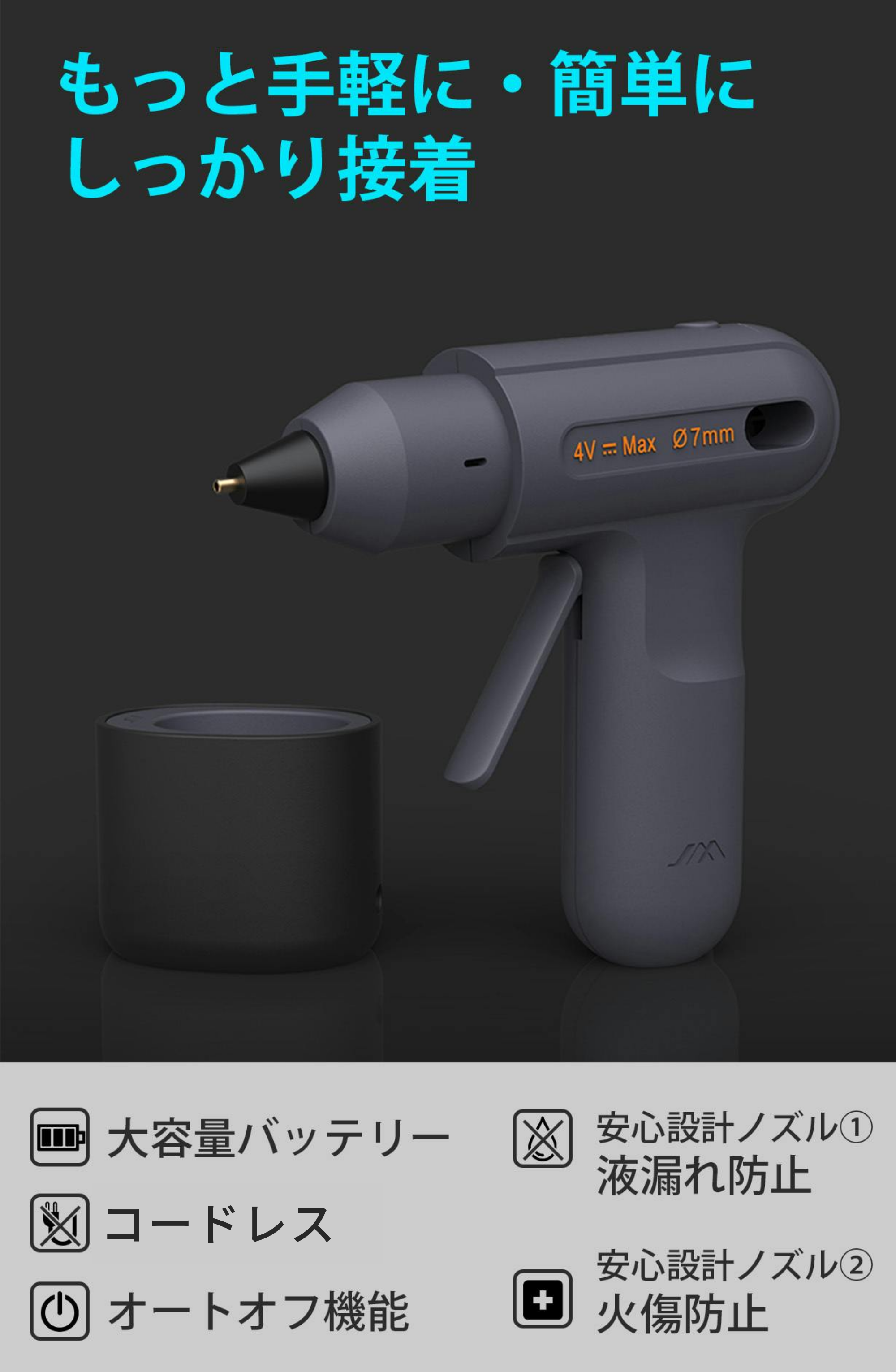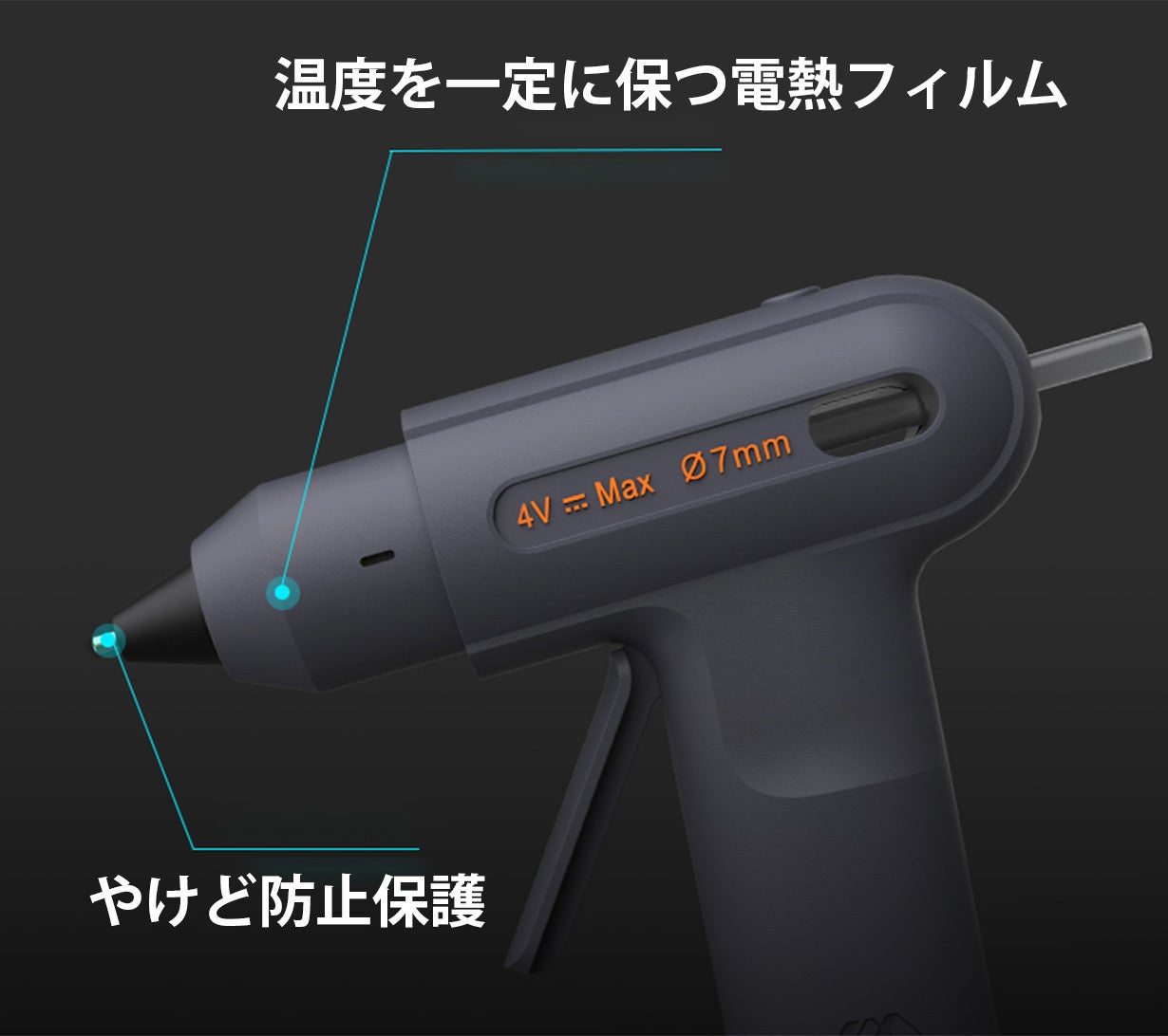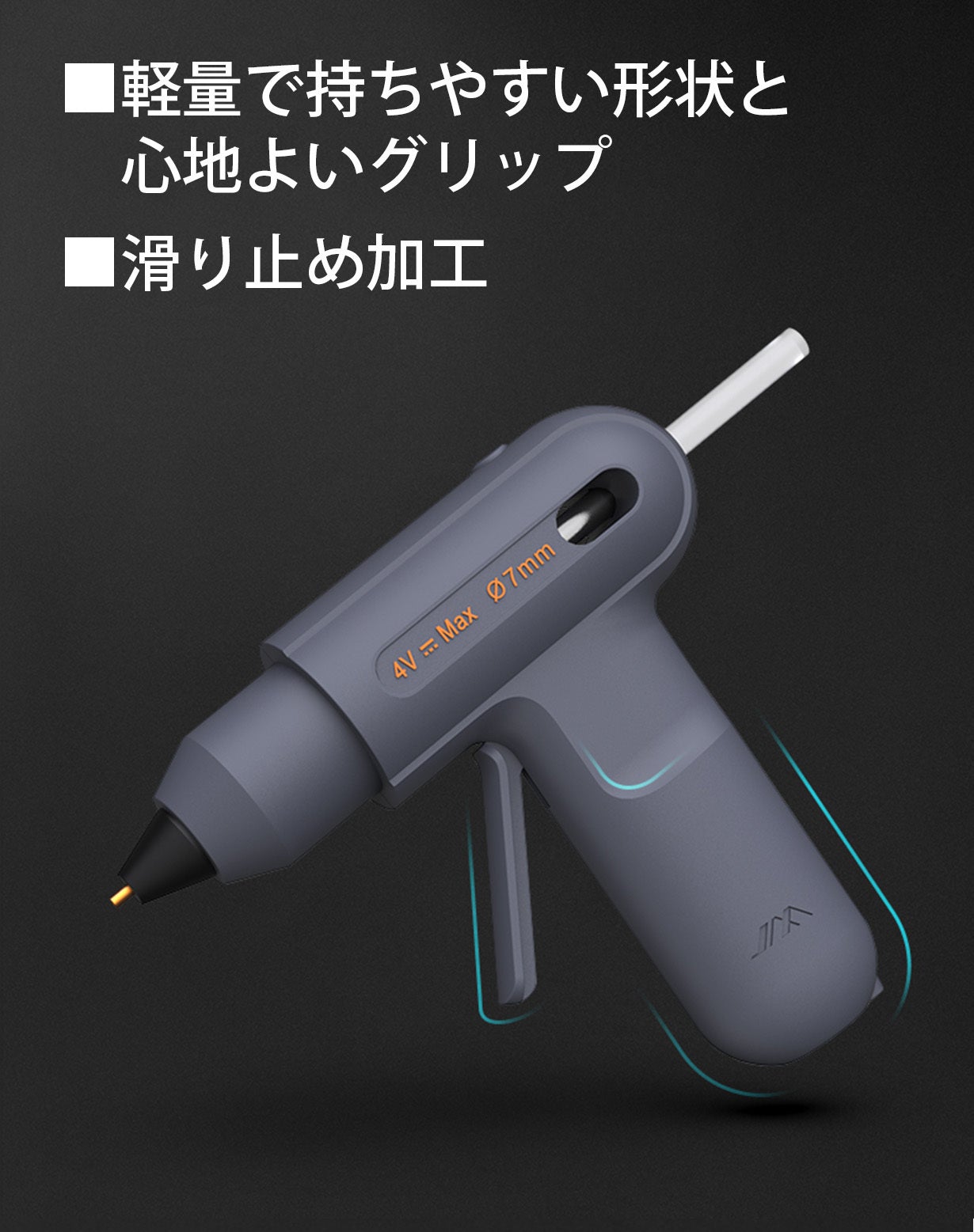 JIMI GLUE GUNは、厳格な安全基準を満たしており、ノズルには直接触れても熱さを感じにくいように、周囲をシリコン層で覆った接触防止保護がついているなど耐熱性と安全性に配慮した設計がなされています。