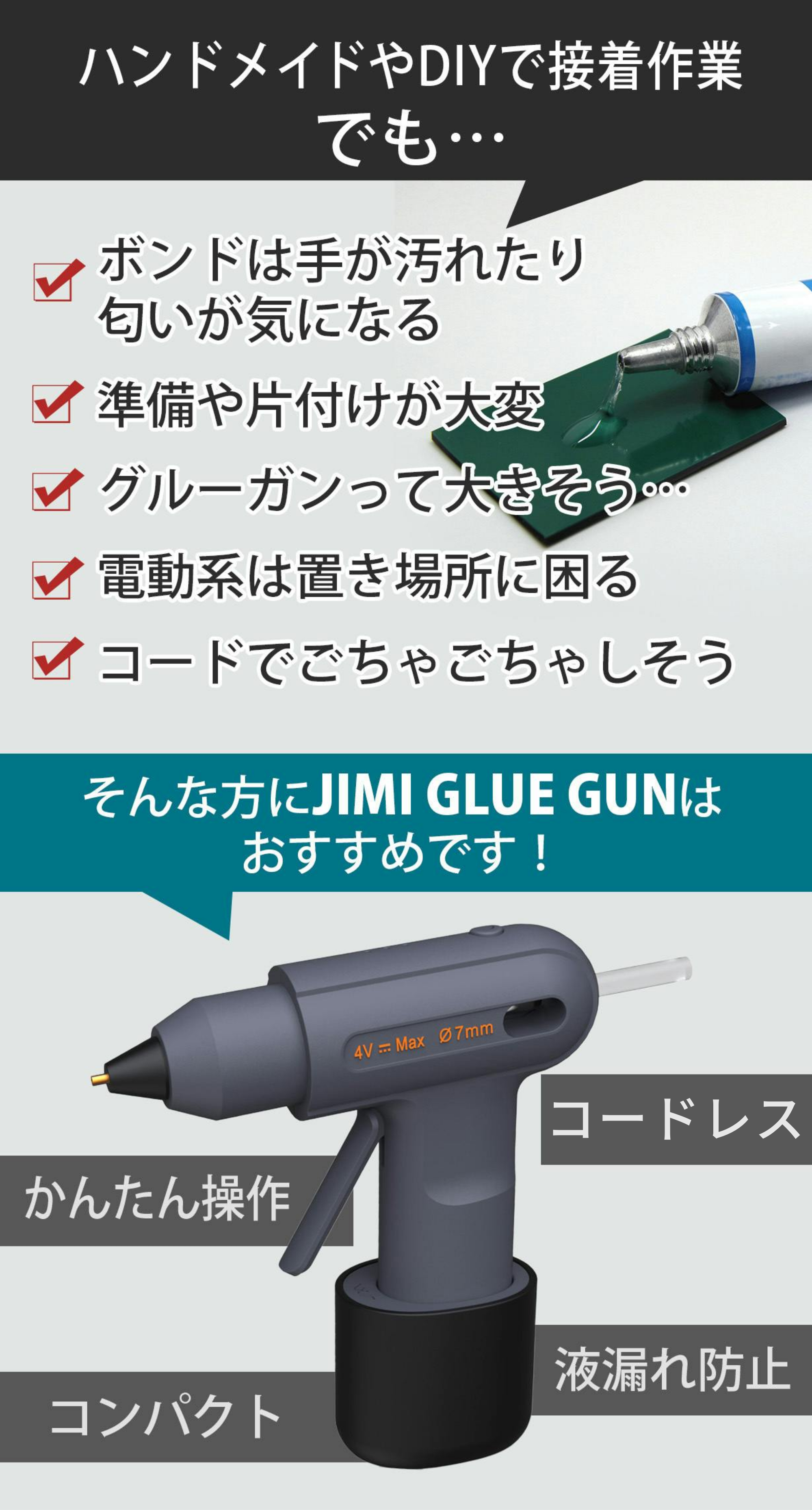 JIMI GLUE GUNはハンドメイドやDIYで欠かせない接着作業に最適な接着用ツール。電熱式のグルーガンと聞くと、火傷や扱いに注意しなければならない敷居の高い工具のようなイメージをお持ちの方もいらっしゃるかと思いますが、お子様と一緒でも使っていただけるシーンを想定して、火傷防止など安全面に配慮し、シンプルな操作設計にしました。