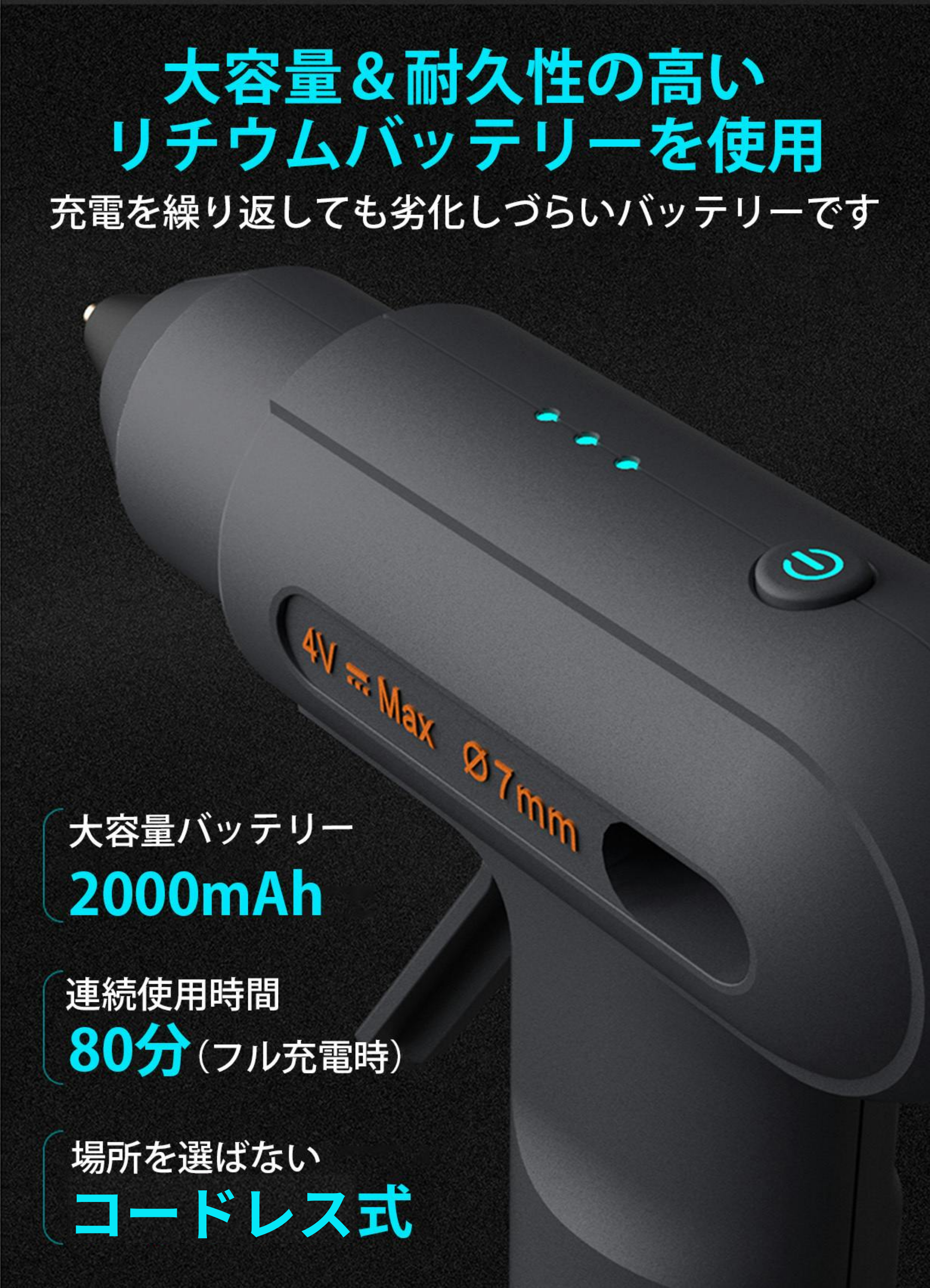 2000mAhのバッテリー容量により、フル充電後80分間の連続使用が可能です。