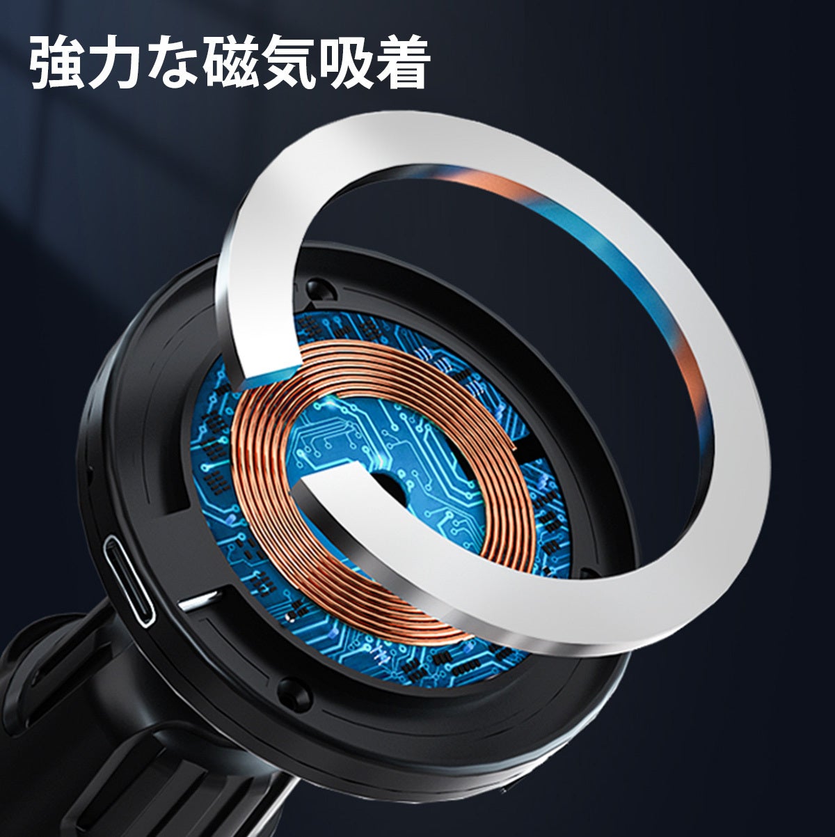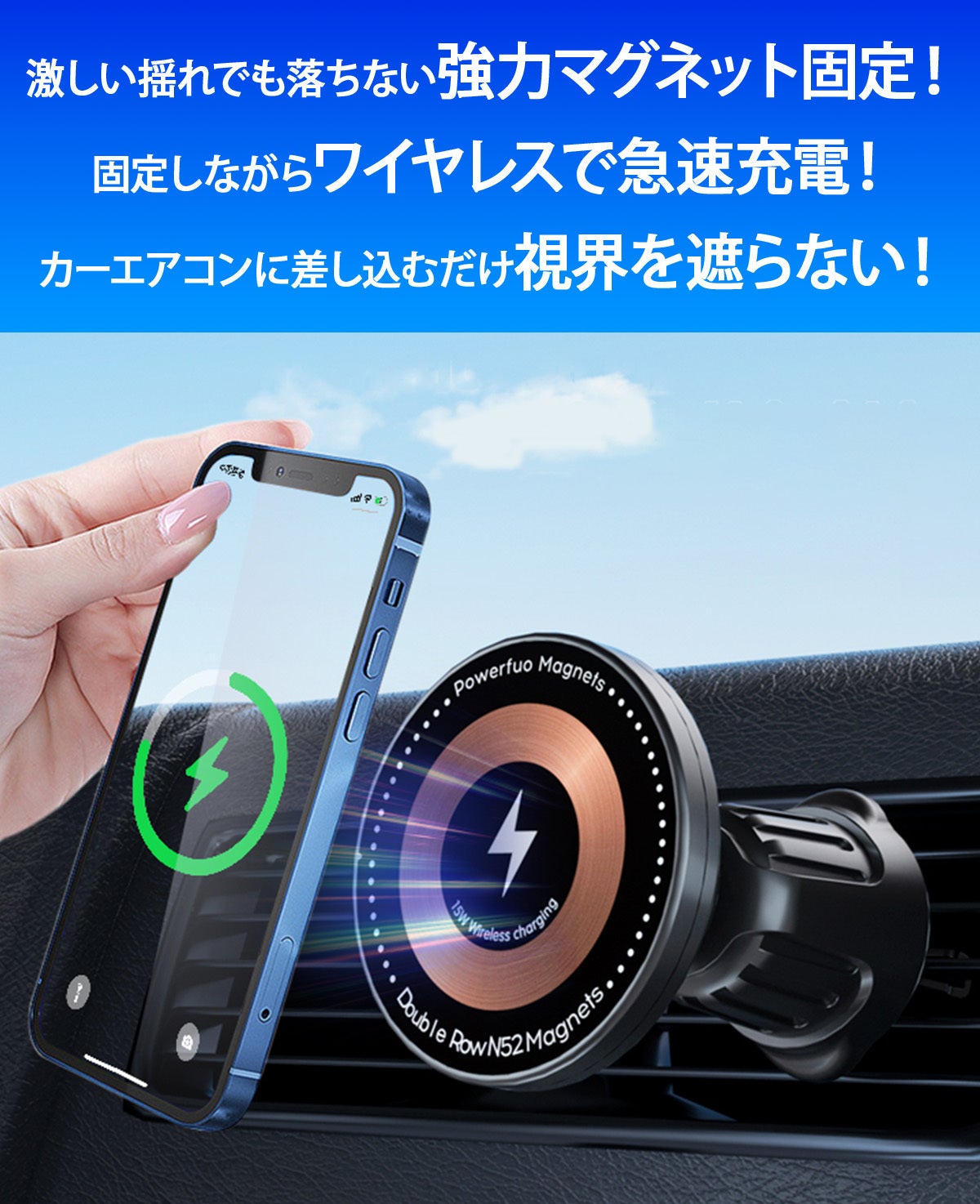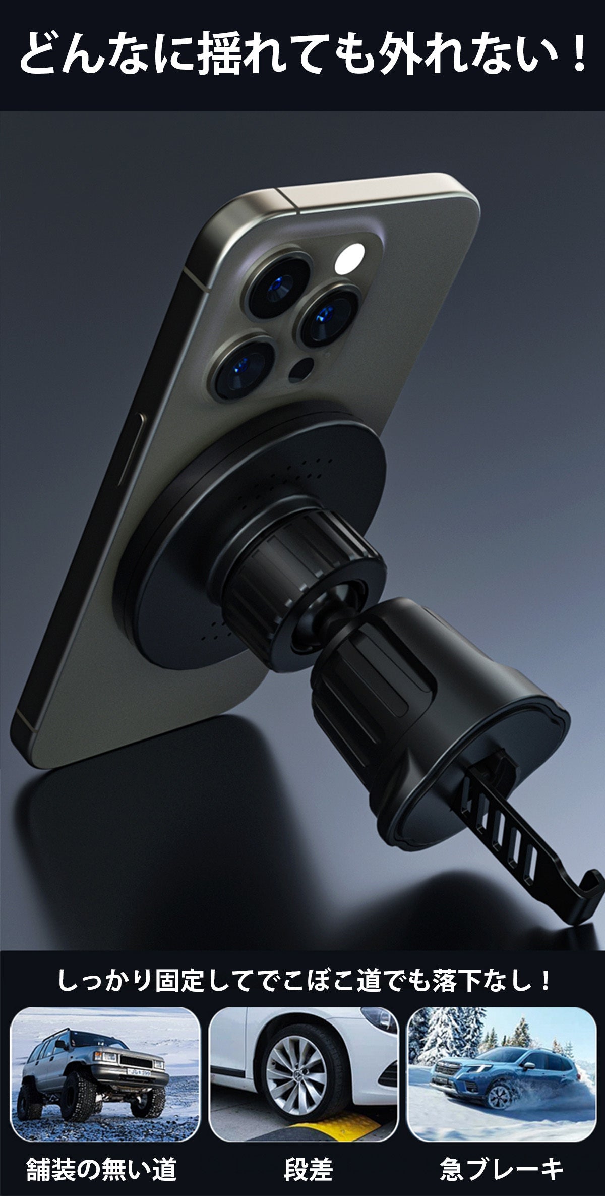 でこぼこ道や急カーブ・急ブレーキなど車のあらゆる揺れにもびくともしない磁力でスマホをがっちり固定!