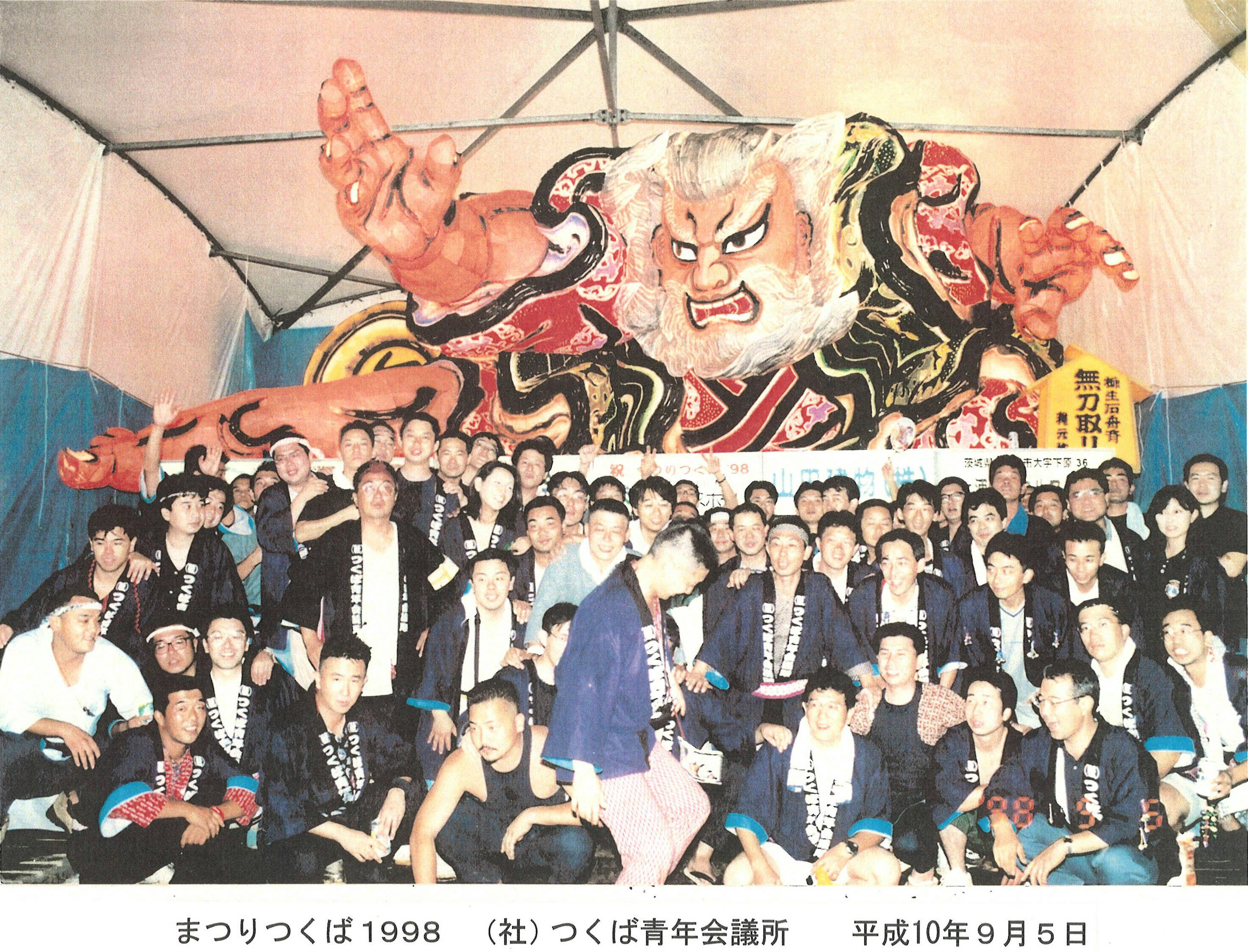 (発足当時のメンバーと、青森からお借りしたねぶた。当時のまつりつくばは、フリーマーケットのようなもので規模も小さかった。開催自体を知らない市民も多いなか、試し運行した初回の際の写真。)