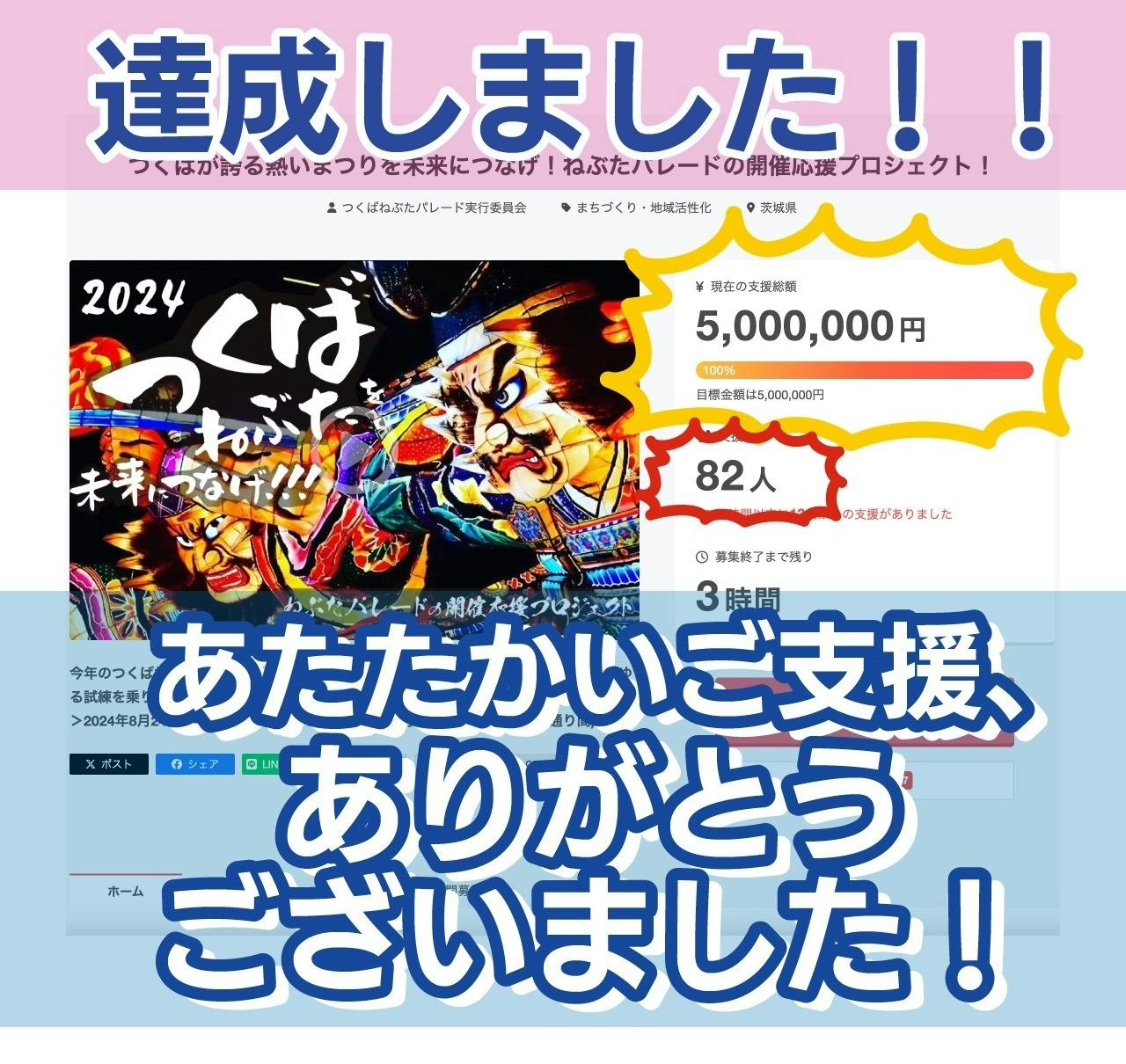 2024/09/01 12:31無事目標金額に到達する事が出来ました!!皆様ご支援ご協力ありがとうございましたm(__)m祭りも無事に開催する事ができ、大成功で終わる事ができました。皆様の応援を力にして来年以降、未来にこの祭りを残していきたいお思います!皆様本当にありがとうございましたm(__)m もっと見る