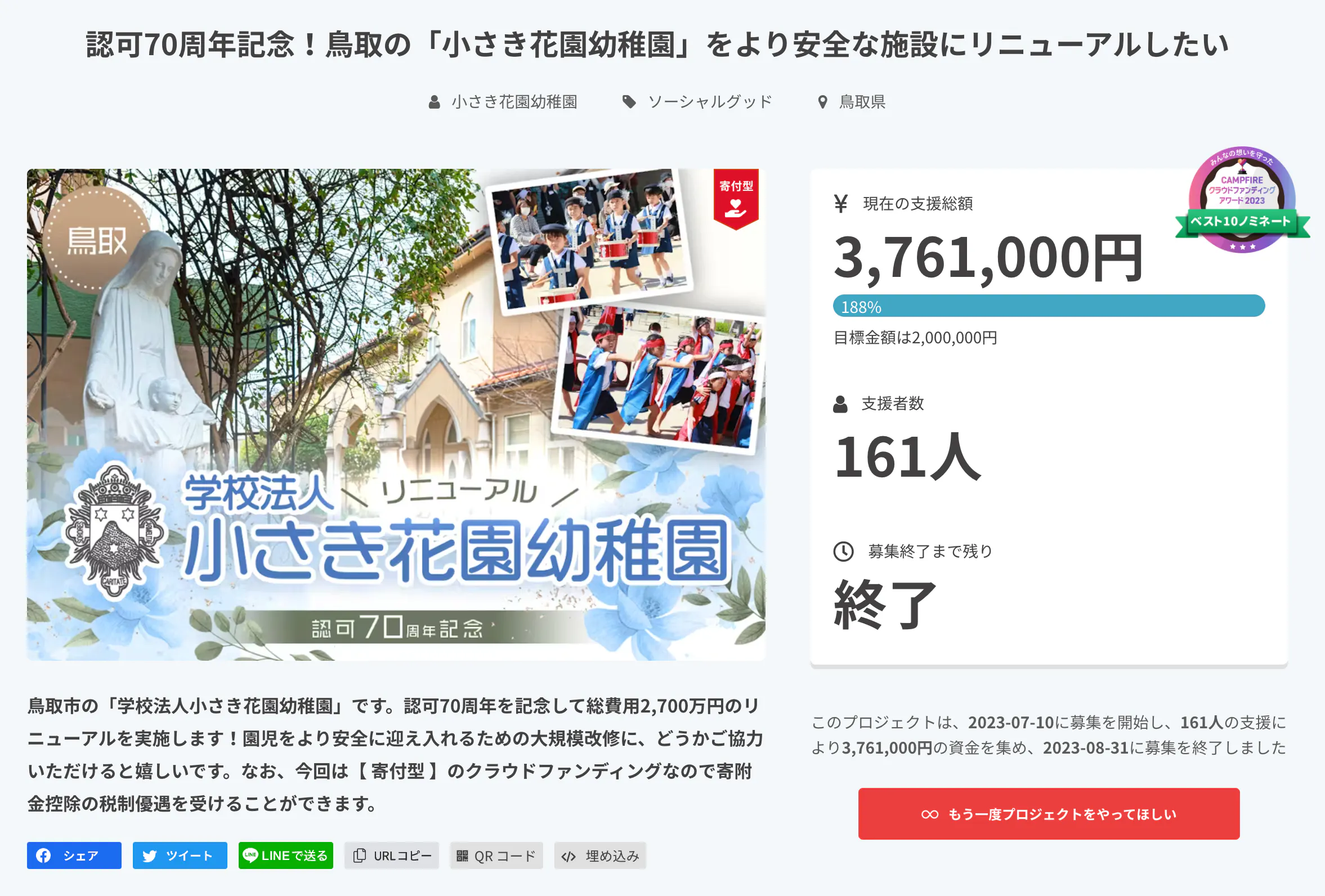 ※領収証はCAMPFIREではなく学校法人小さき花園幼稚園が発行および郵送をいたします。