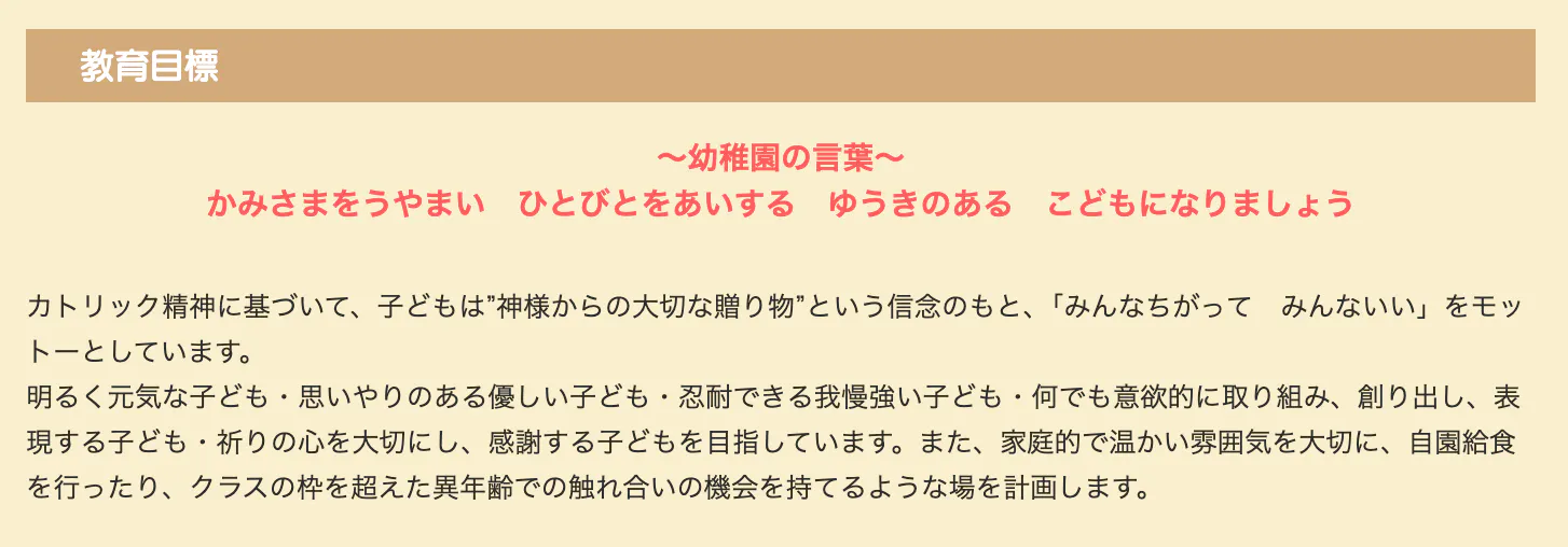 家庭的であたたかい雰囲気の幼稚園を目指して、地元産&国産の食材を使った自園給食の実施をしたり、クラス内活動やクラスの枠を超えた触れ合いの機会を持てるような場を作るなど、独自の特色も打ち出しています。