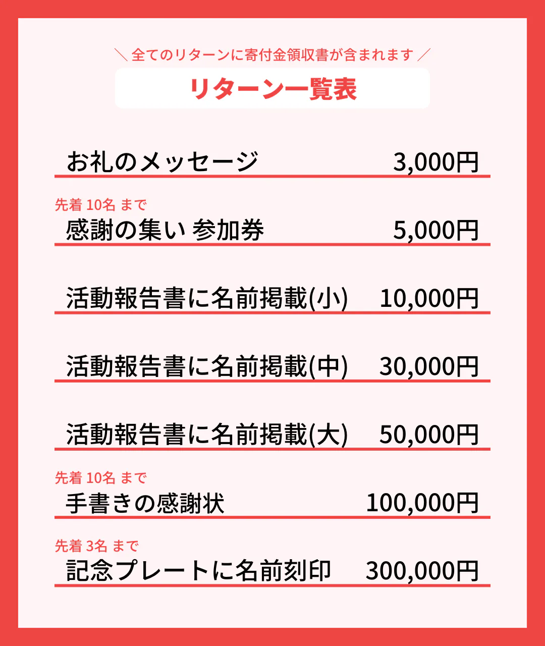 全てのリターンに寄付金領収書が付いており、どのリターンを支援いただいても寄附金控除の対象になります。