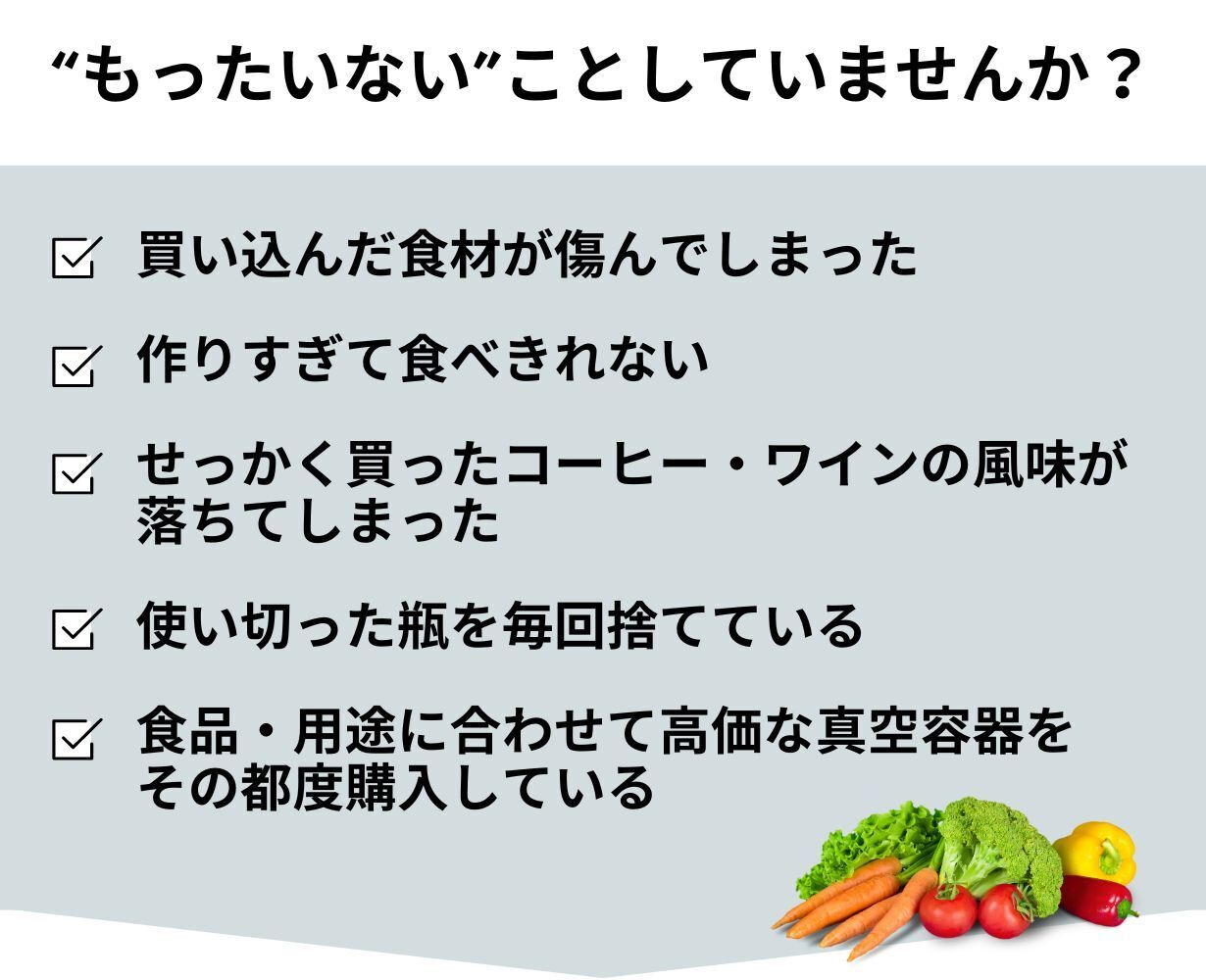 真空保存することで、食品を新鮮な状態に保つことができ、フードロスを防ぐだけではなく、食品やワインをより長期間おいしい状態で楽しむことができます。