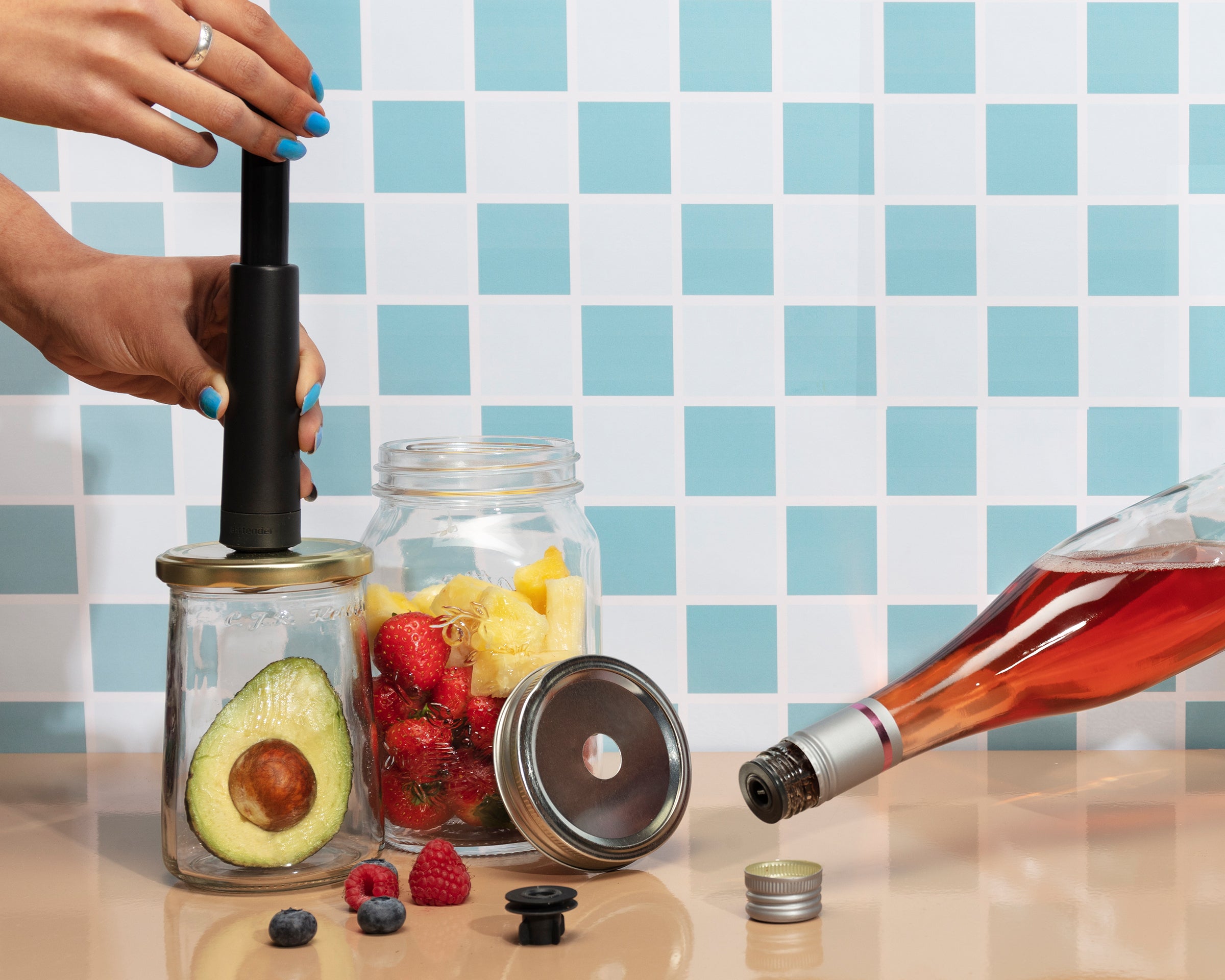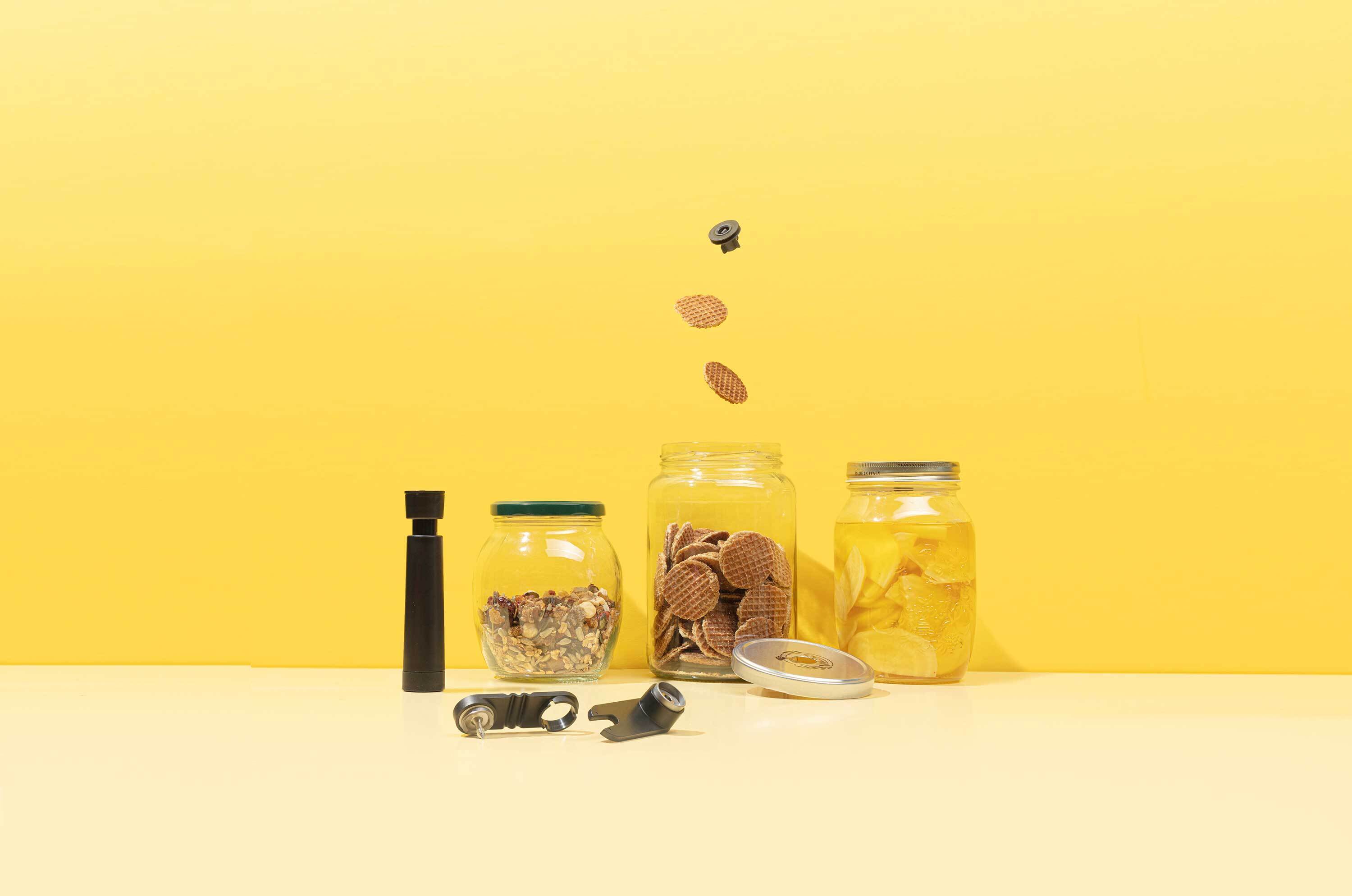 エアテンダーの真空ツールを使えば、付属のパンチで金属製のふたに素早く、安全に穴を開けることができ、自分専用の真空容器が完成します。