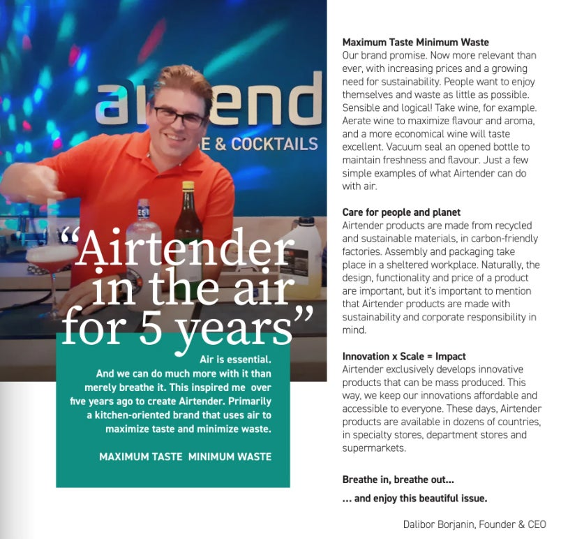2024/08/30 09:00本日がプロジェクトの最終日となりました!ご支援いただき、誠にありがとうございます。最後に、Airtender CEOのダリボール・ボルジャニンさんのメッセージをお届けしたいと思います。Airtenderの公式サイトでは、マガジンの発行をしています。https://ww.airtender.com/en/magazines/日本語版がないのは残念ですが、以下に翻訳を記載していますので、ぜひエアテンダーの理解を深めていただけると嬉しいです。✎__本日はCEOのダリボール・ボルジャニンさんのメッセージをお届け◎最大限の味 最小限の無駄私たちのブランド・プロミス です。現在、物価が上昇し、持続可能性へのニーズが高まる中、私たちのブランドはこれまで以上に重要性を増しています。人々は、できるだけ無駄を省いて楽しみたいと思っています。賢明で論理的!例えばワイン。風味とアロマを最大限に引き出すためにワインに空気を含ませれば、お手頃のワインも素晴らしい味になる。開封したボトルを真空パックにすれば、鮮度と風味を保つことができる。Airtenderが空気でできることのほんの一例です。◎人と地球への配慮エアテンダーの製品は、リサイクル素材や持続可能な素材を使用し、カーボンフレンドリーな工場で製造されています。組み立てと包装は、安全な職場で行われます。もちろん、製品のデザイン、機能性、価格も重要ですが、エアテンダー製品が持続可能性と企業責任を念頭に置いて作られていることもとても大切なことです。◎イノベーション×スケール=インパクトエアテンダーは、大量生産が可能な革新的な製品のみを開発しています。そうすることで、私たちの革新的な製品を手頃な価格で、誰もが手に入れられるようにしているのです。現在、エアテンダーの製品は、数十カ国の専門店、デパート、スーパーマーケットで販売されています。私は日本輸入代理店として、瓶を真空容器にできるという革新的なアイディアに魅了されたのはもちろんのこと、徹底的に環境に配慮した企業姿勢に感銘を受け、ぜひ日本で販売したいと思いました。皆さまにとって、マガジンがAirtenderへの理解を深める一助となれば幸いです。 もっと見る【GIZMODEに紹介されました!】真空容器がタダで手に入る!? 空きビンを有効活用できる「airtender」