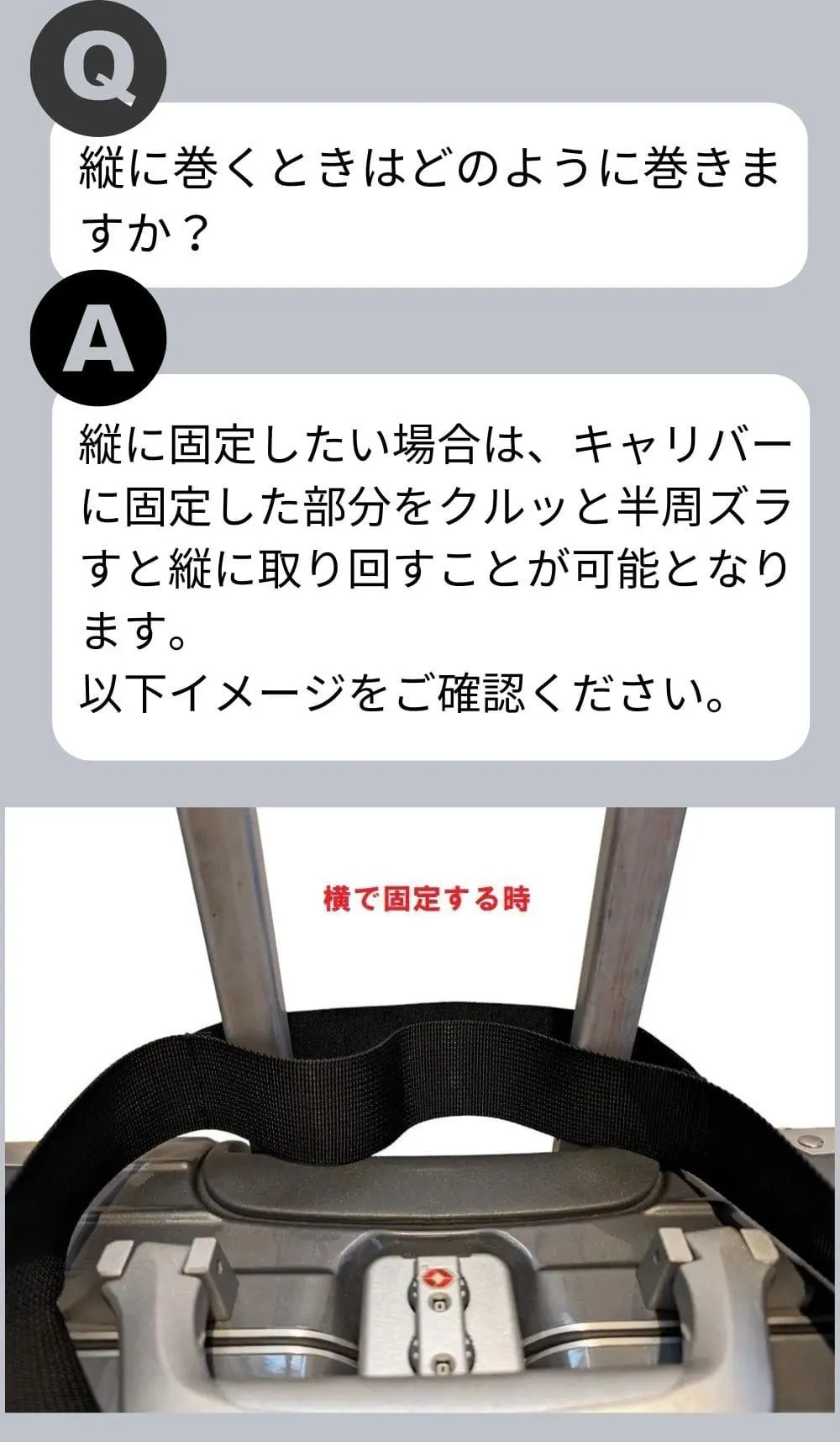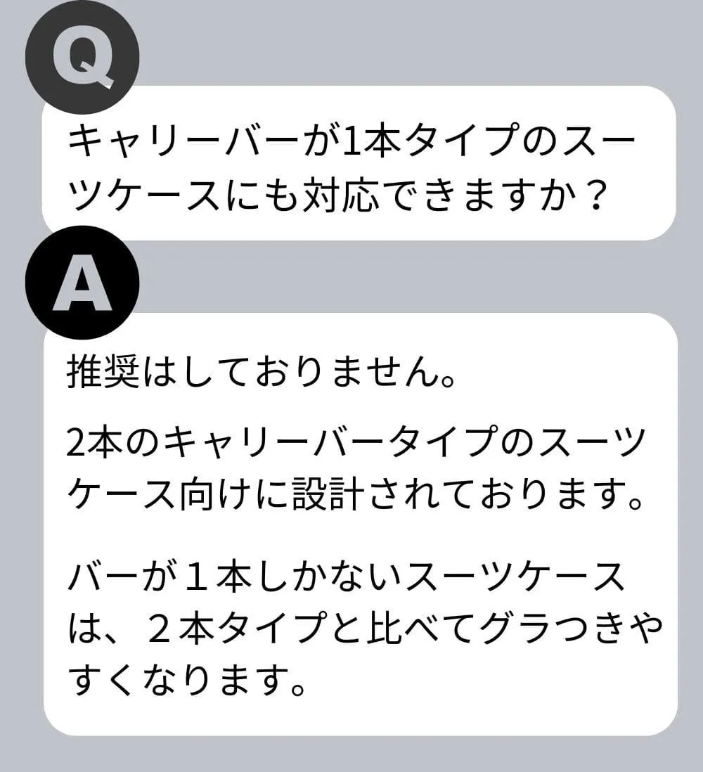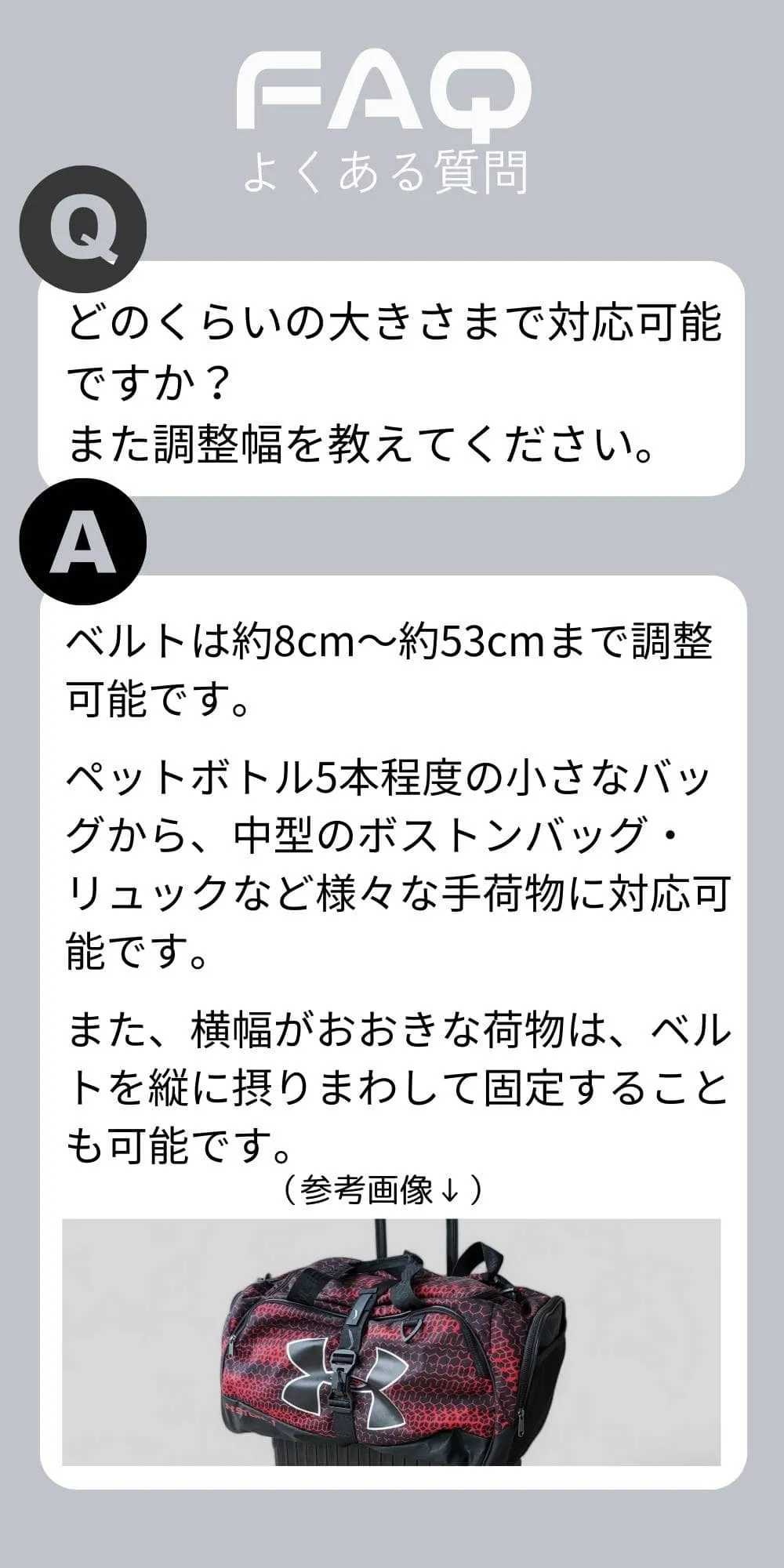 2024/07/24 06:59皆さまお世話になります。サポータ様から、キャリバーが、スーツケース幅の「幅広タイプ」にも利用できますか?というご質問を頂きましたので、こちらにも共有させていただきます!スーツケースケースのキャリバーの幅は約23cmまで対応可能です。ベルト通し口の片方は、伸縮性のあるゴム素材となっておりますが、 添付写真のタイプのように、スーツケース幅に沿うような幅広のキャリバーには、取り付けできないため、購入前にご確認をよろしくお願いいたします。 もっと見る
