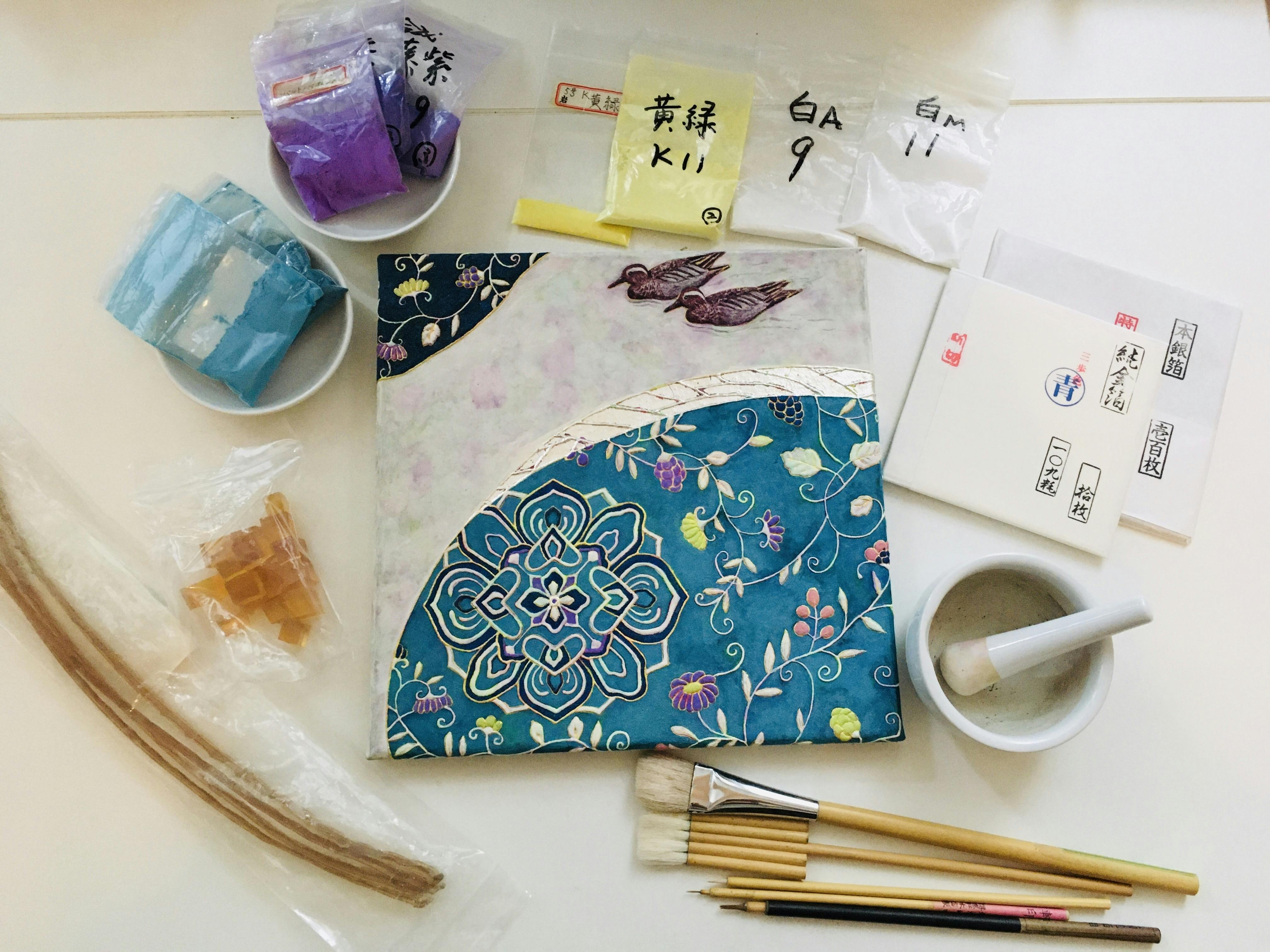 日本で1,300年前から続く伝統的なアート様式で天然物質を主材料とする。最も顕著な特徴としては、鉱石やガラス、水晶などを砕いて作る岩絵具を主な着色材料として用いる事と、接着剤として動物膠を用いる事である。また金箔や銀箔などの金属由来の材料も使用する。完成までに多くの工程を要し、制作期間が長くかかる。