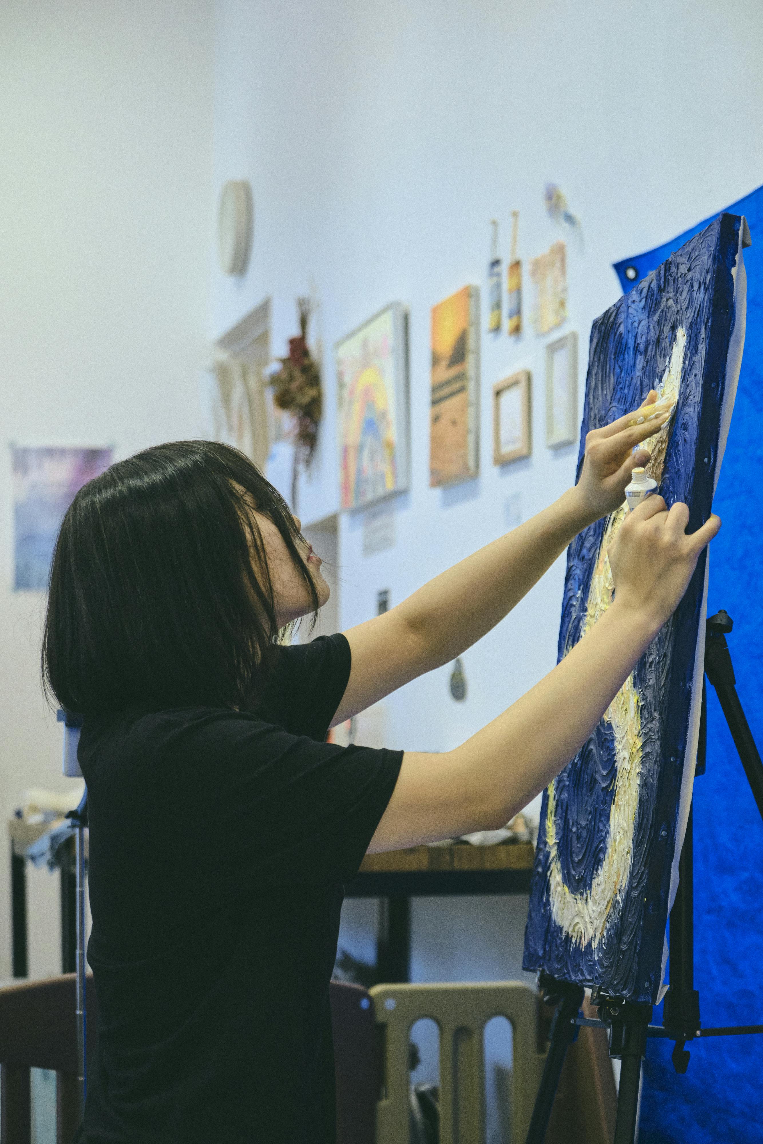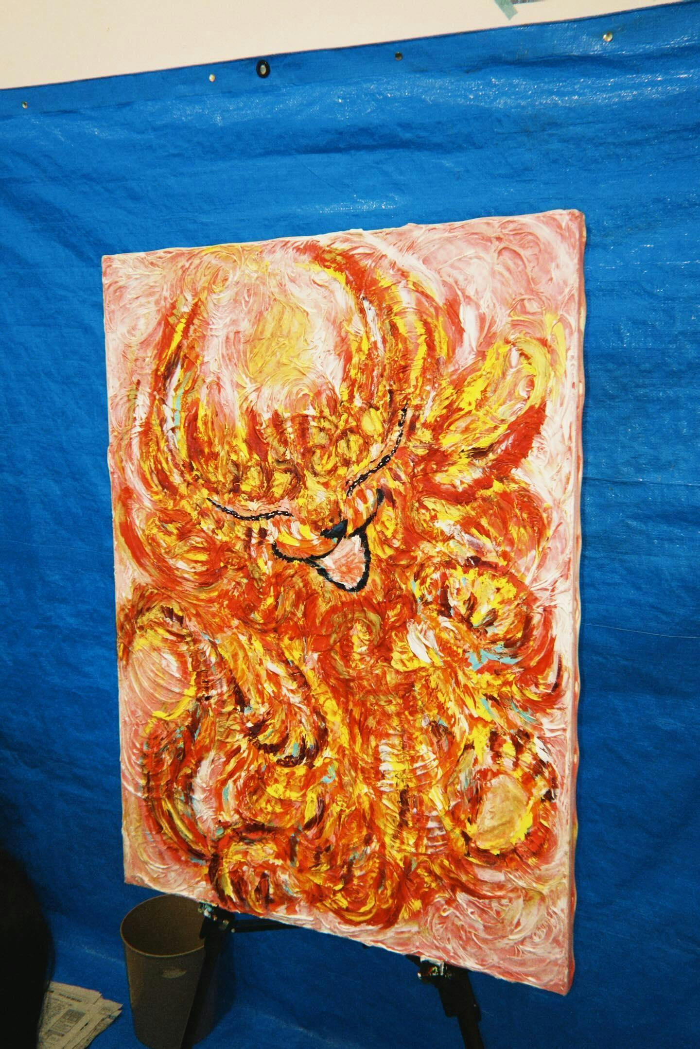 私はキャンバスにモデリングペーストでデコボコ渦巻きを作り、その上からアクリル絵の具で指描きアートを描いています。