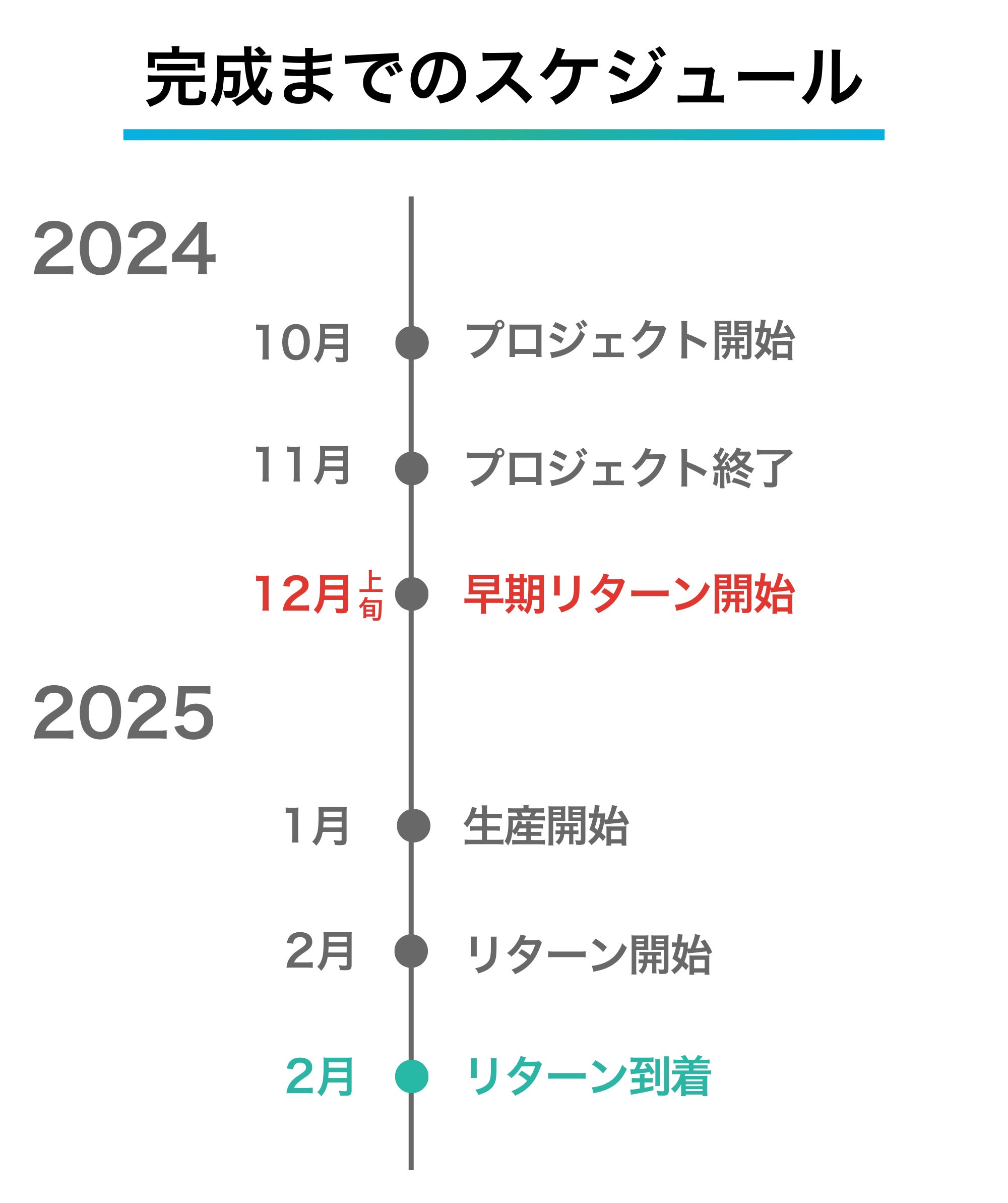 ※本文中に記載させていただいたスケジュールは、あくまでプロジェクト公開時点の予定です。支援の性質上、配送遅延のおそれがございます。