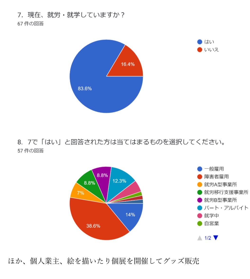 ソーシャルフットボール全国大会後(第4回、第5回)に出場選手を対象にしたアンケート集計結果を見ると、合計3割の選手が未就労・就労訓練中・B型作業所勤務(工賃の平均が1〜2万、厚生労働省より)となっています。