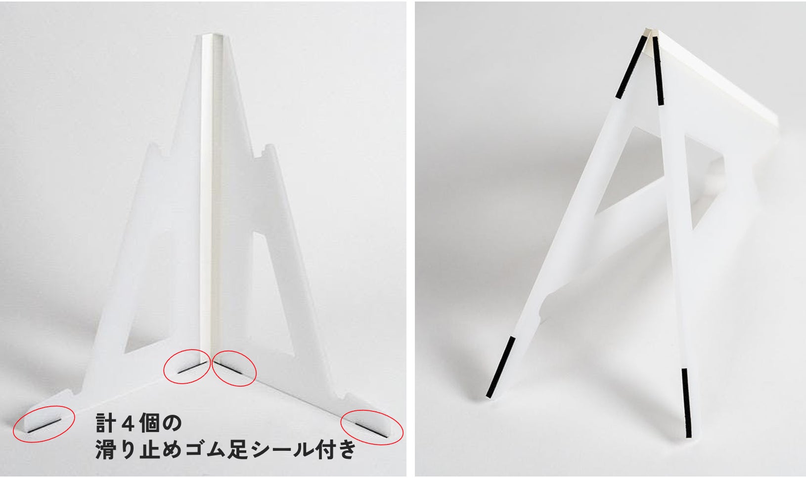 使用中にグラグラしたり不安定にならない?と感じる方のために、滑り止めのゴム足シールを付属。底の4箇所にこのシールを貼っていただくことで安定感がアップします。また、吸着力が落ちてきた場合は、水洗いで復活します。