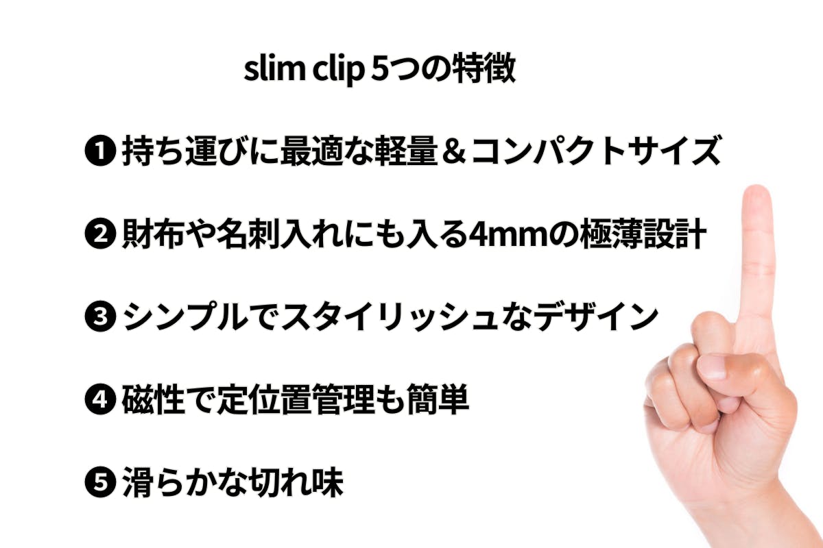長さ6.2㎝、軽さ15.6gの「Slim Clip」は、財布や名刺入れに入れて持ち運べるので、突然の商談やデート前にもすぐに使えます。