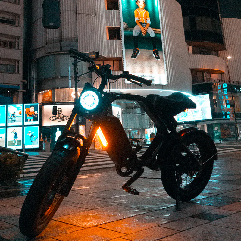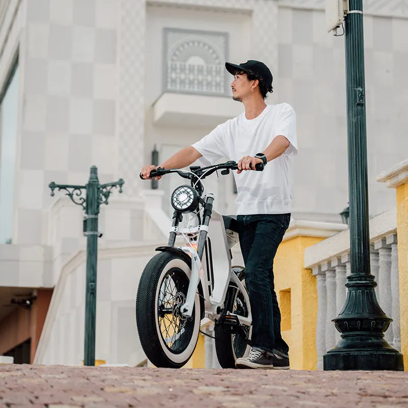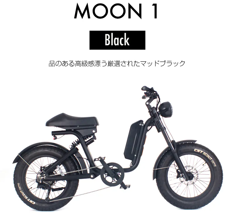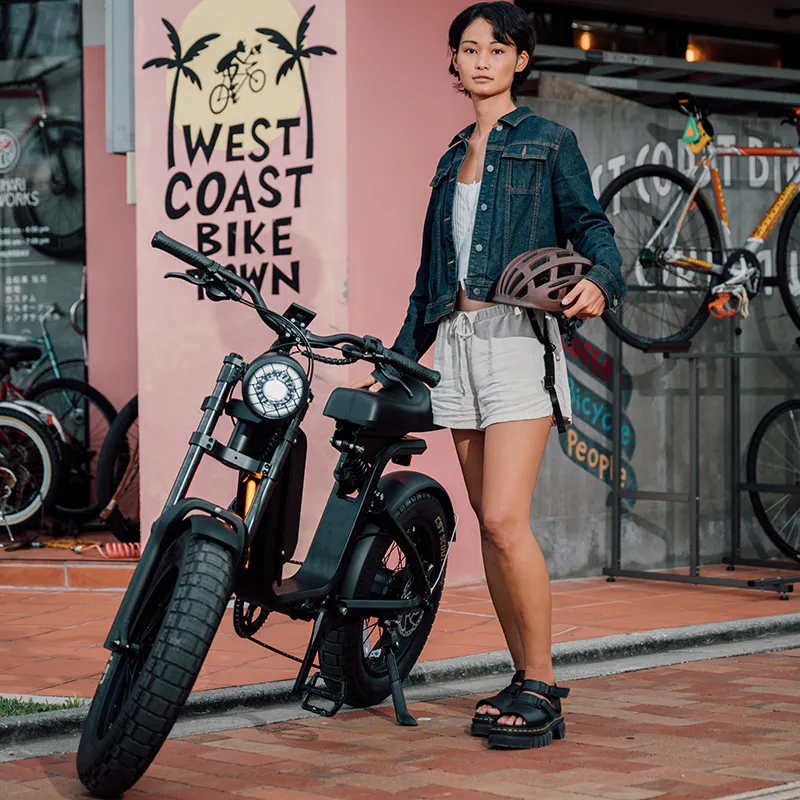 A: 通常モデル(48V/14AH)/エコモードで80km程度の走行が可能です。*拡張バッテリー(48V/21AH)搭載し最大110km程度までカスタム可能ですです。