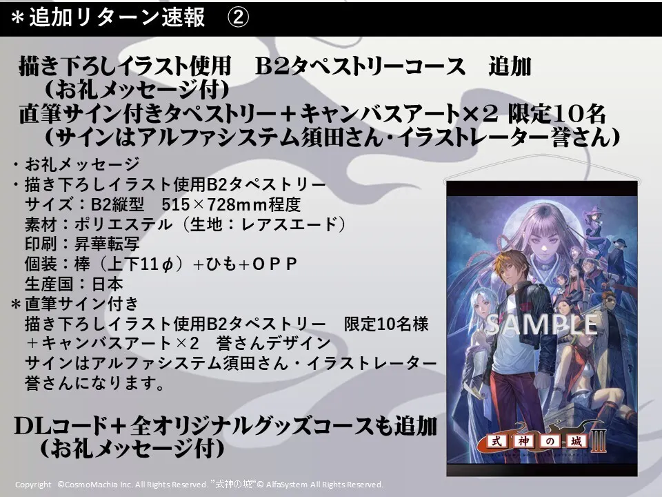 2点あります。 1.七夜月幻想曲が式神の城3の前日譚に当たるのですが、当時アルファシステムさんで公開されていた短編集が七夜月幻想曲の設定資料に収録されていません。こちら、今回のクラウドファウンディングの設定資料や別途返礼品に入れていただくことは可能でしょうか。 2.式神3といえば誉さんなのは間違いないのですが、園田未来さんの絵に一目惚れして式神の城を始めた為、園田さんの絵での 新キャラだけでなく、ロジャーと日向さん等もキャンパスアートにならないでしょうか。 正直に白状します。園田さんのロジャー子とミュンヒ子見たいです。