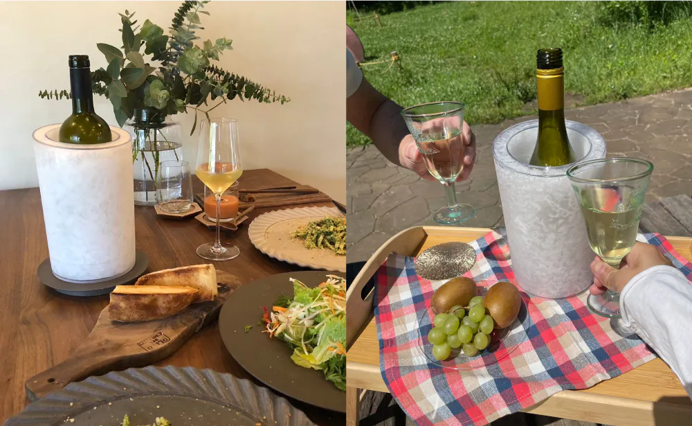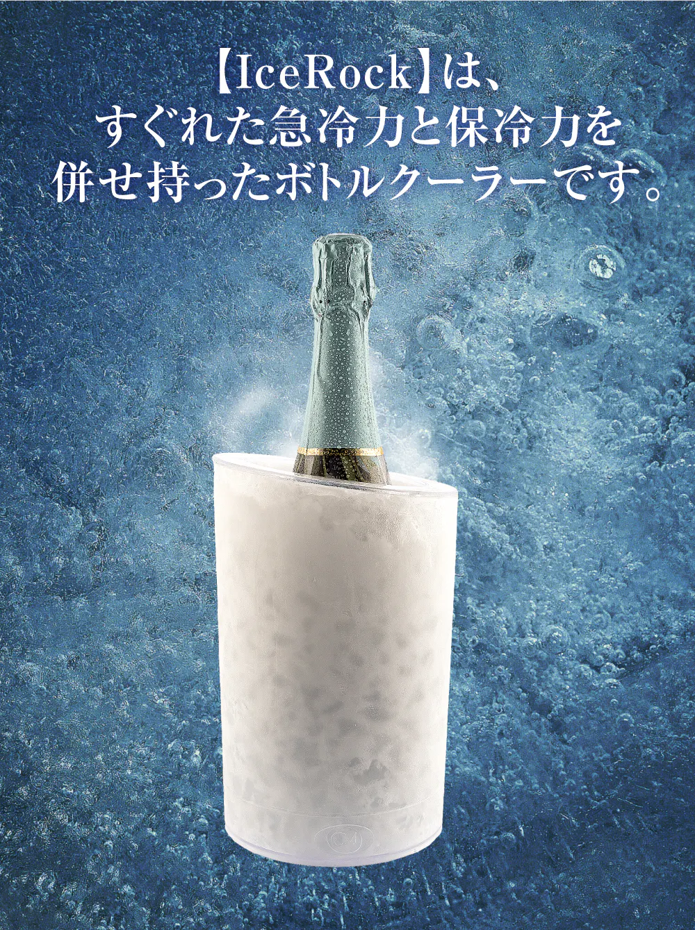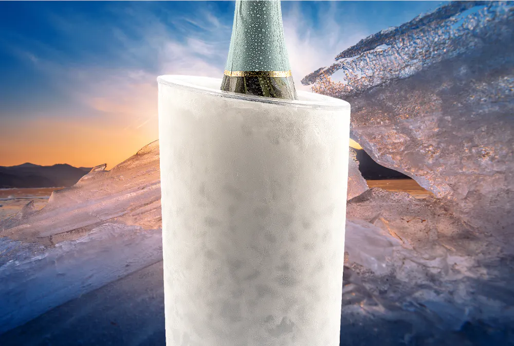 【IceRock】は凍結ジェルを備えた二重構造のクーラーで、ワインやシャンパンのボトルを迅速かつ効果的に冷却するように設計されています。氷の追加を省き水の無駄を削減します。