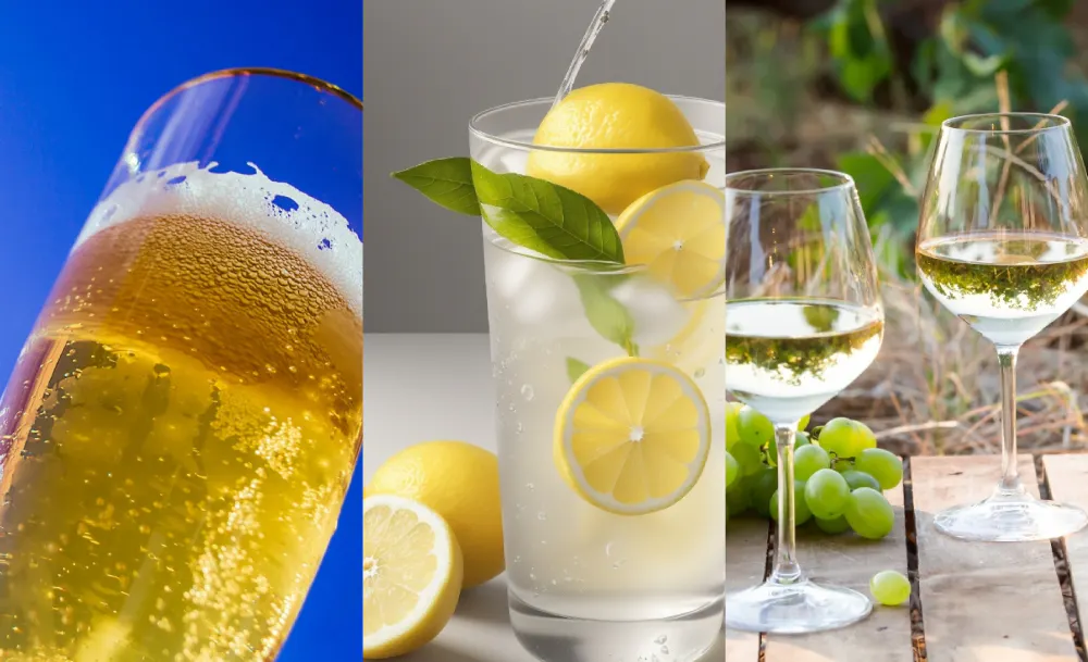 水、麦茶、オレンジジュース、ビール、コーラ、冷酒、スパークリングワイン、白ワイン。