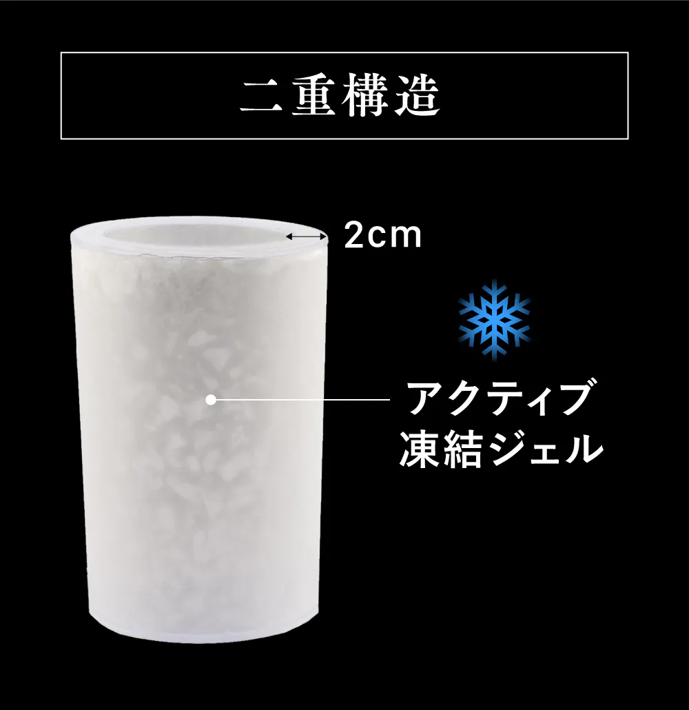 幅2cmの空間にはアクティブ凍結ジェルがぎゅっと詰まっており、マイナスの冷気が長時間放出され、お好みのボトルを早く、長く冷やします。