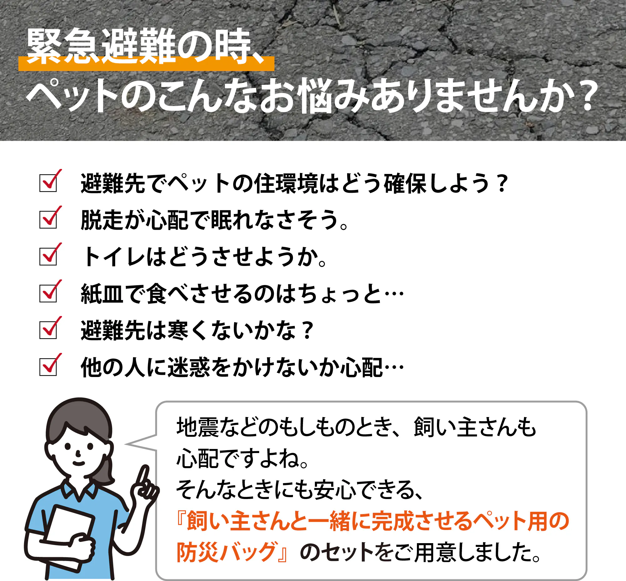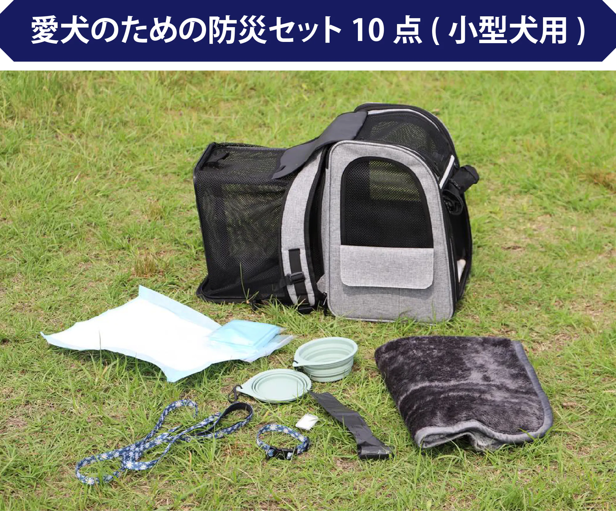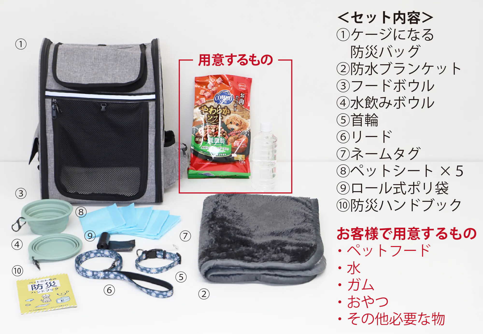 ペットが避難先で必要となる、必須アイテムをまとめた 10 点セットとなっております。