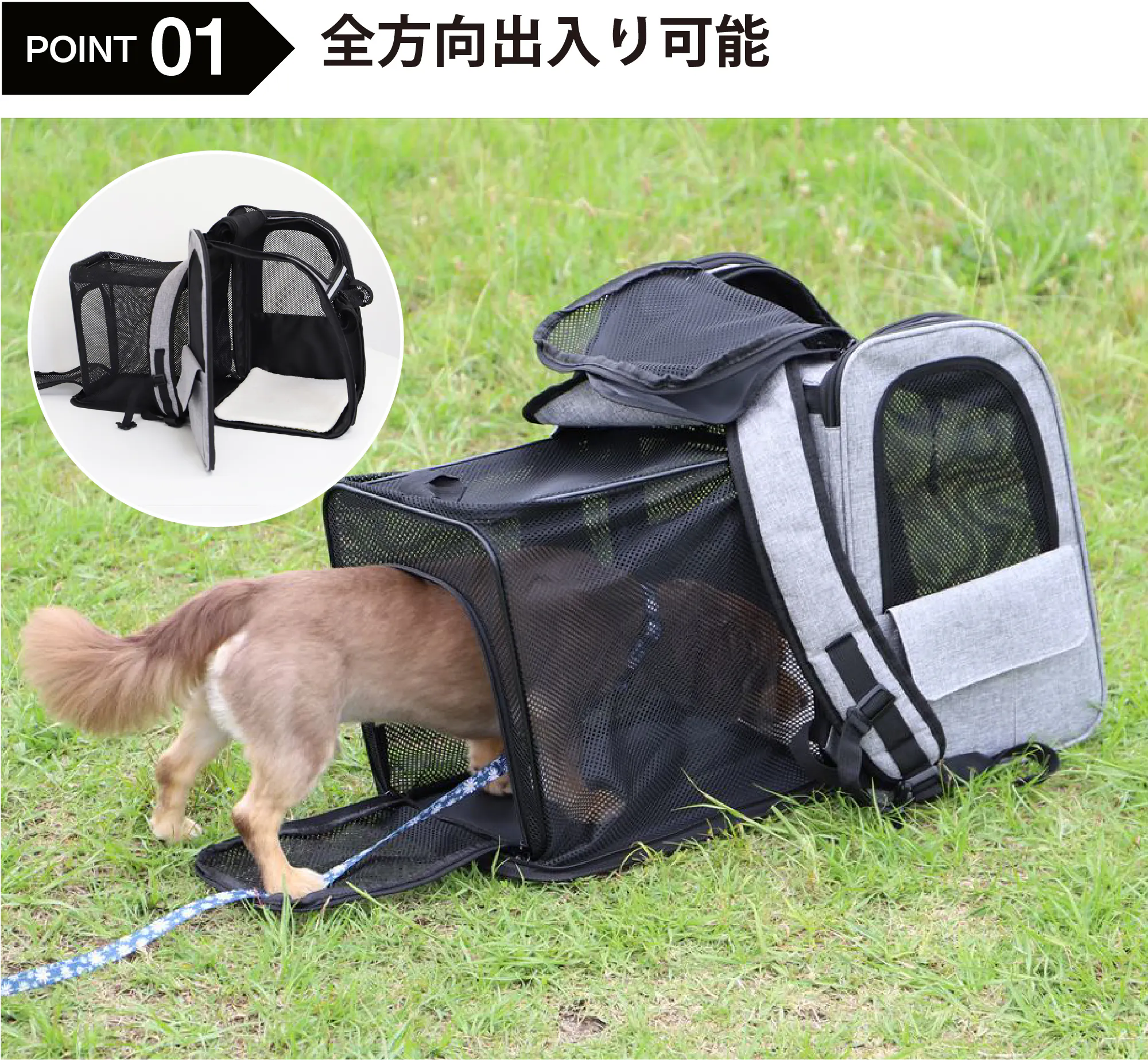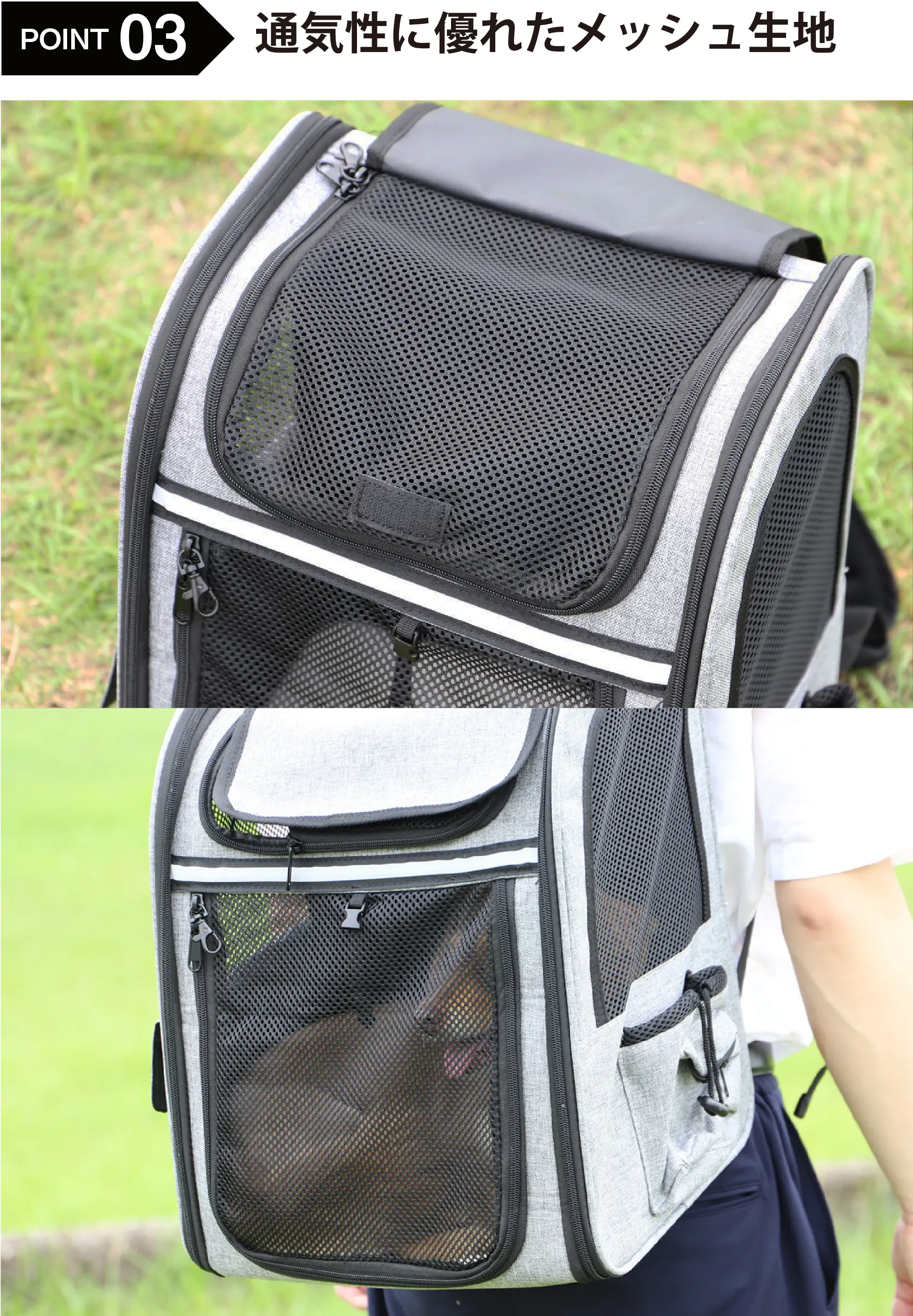 底面以外がメッシュになっており通気性も抜群。酸欠などの心配もなく呼吸がしやすい環境です。夏の暑い時期でも安心です。また、メッシュからワンちゃんの状態が確認できますのでご家族の方も小まめにチェックしていただけます。しかし、ある程度は視界を防げますので、ワンちゃんのプライバシーも確保できます。