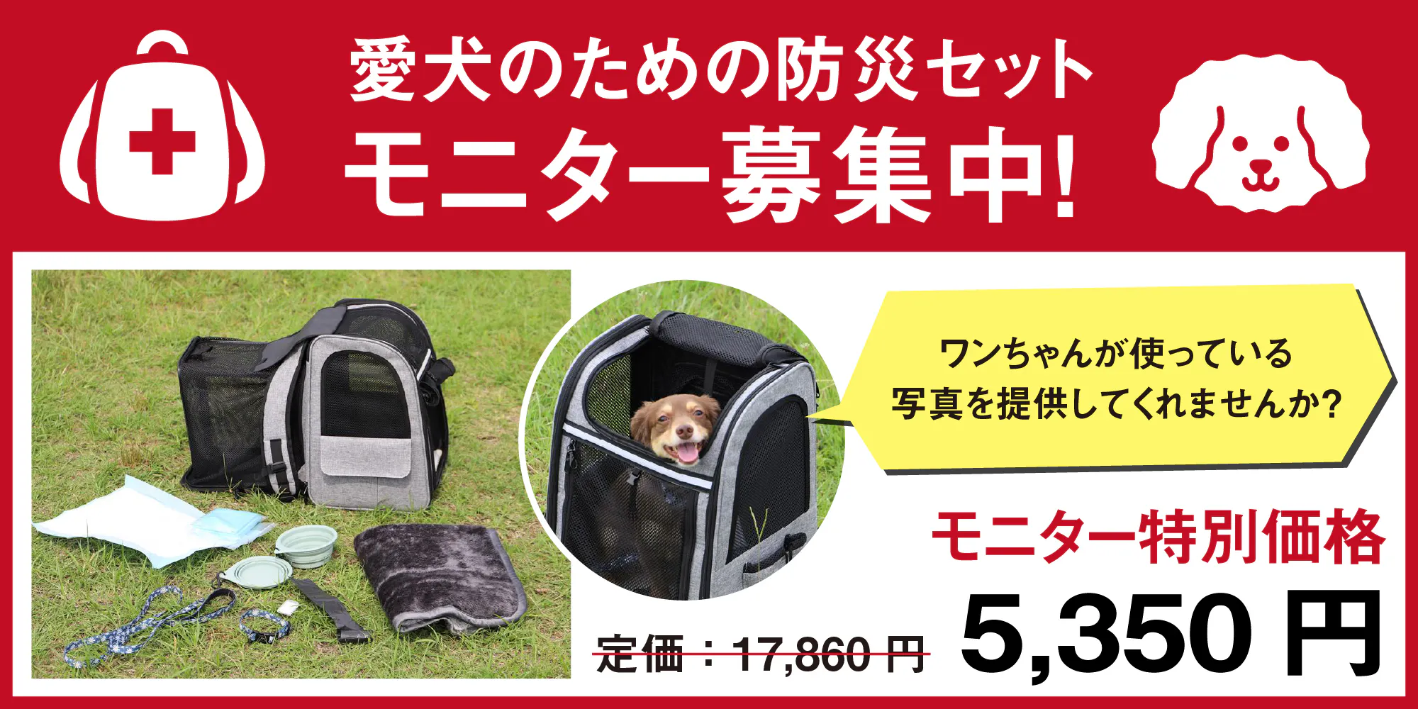 A:人間の家族のための防災セットは多くあり皆様もご用意されているかと思いますが、大事な家族である愛犬のための防災セットはあまりご用意している方が少ないのでは…と思い作ったセットです。