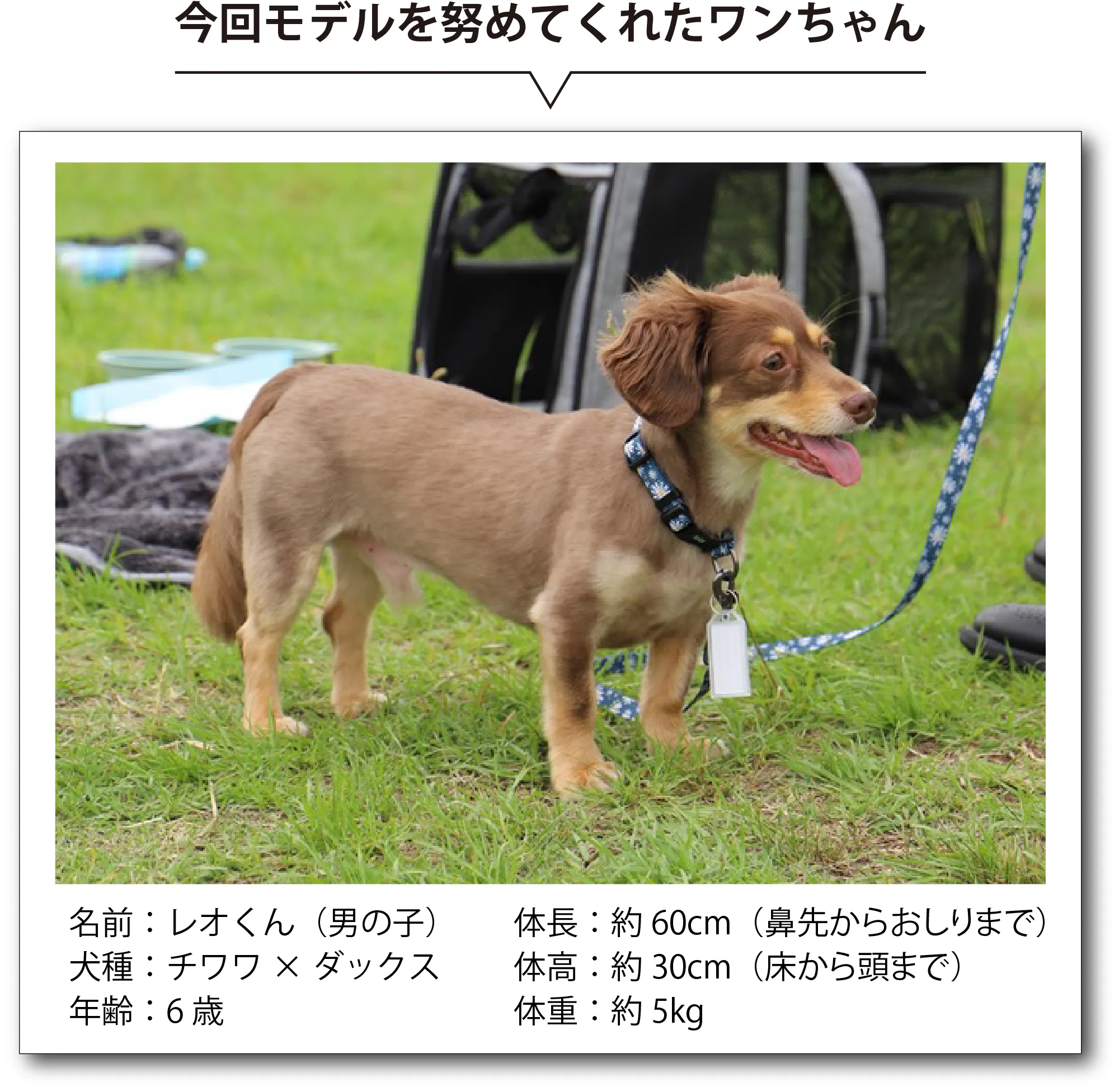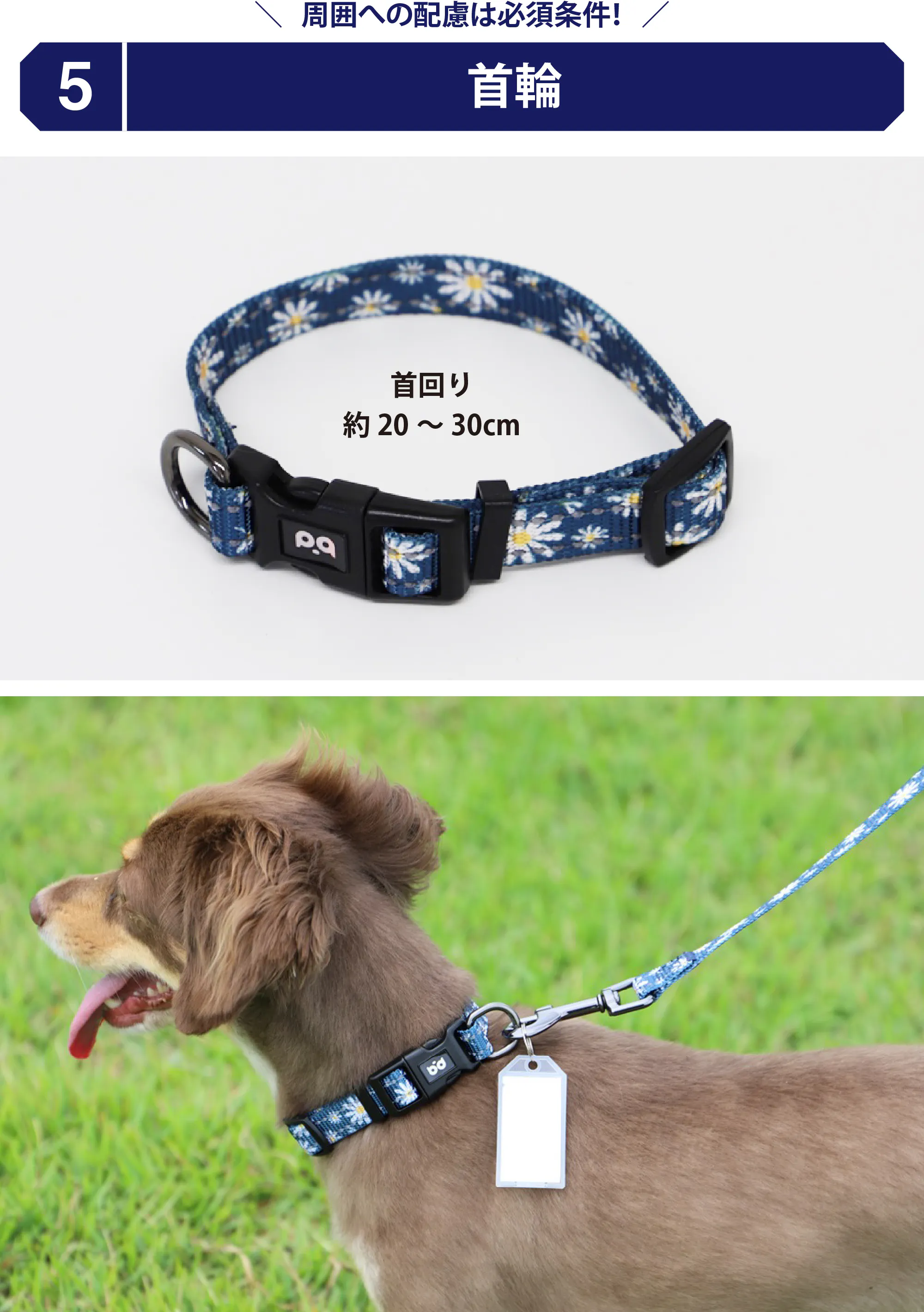 アジャスターで長さが変えられる首輪です。約 20 ~ 30cm に簡単に調節できます。写真のモデルのワンちゃん(チワワ × ダックス:体重約 5kg 程度)で首回り約 25 ~ 26cm ほどになります。サイズが合わなかったり、お気に入りの首輪がある方は別途ご自分でご用意いただき、バッグに入れていただくことをおすすめします。