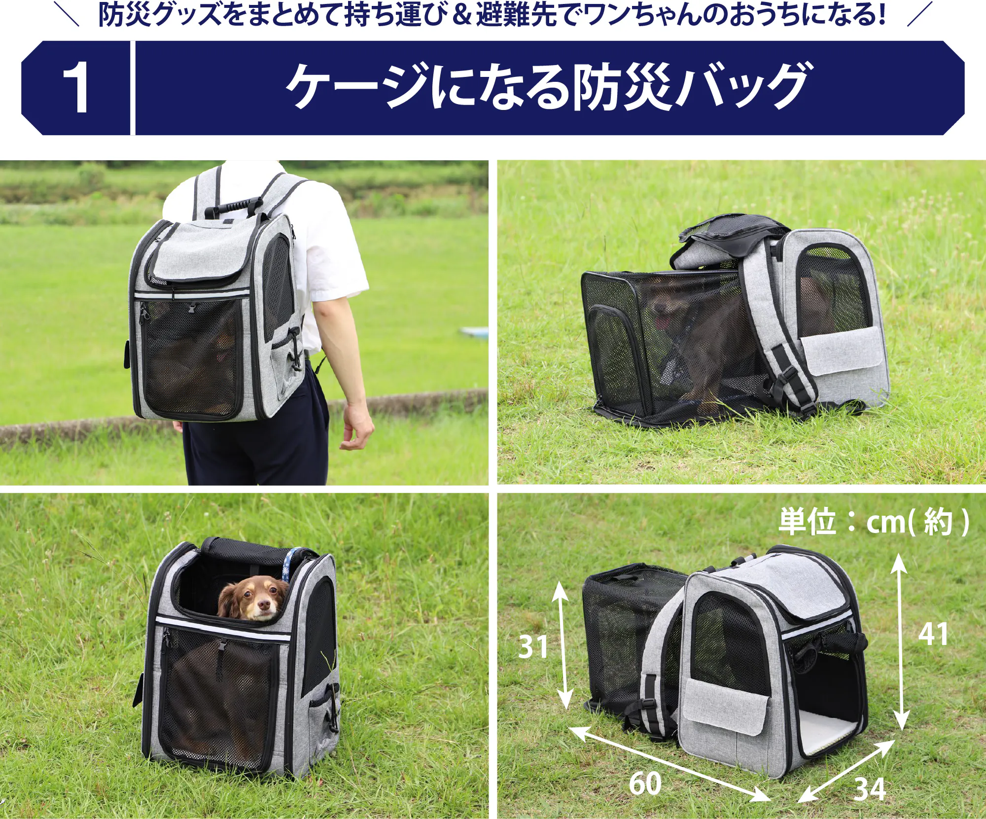 避難時は愛犬の防災グッズを入れた防災バッグとして、避難先では愛犬のハウスとなるケージとして使用していただけます。避難時にはワンちゃんにはご自身で歩いていただくほうが安全に速やかな避難が可能と考えておりますので、バッグに入る想定はしていません。
