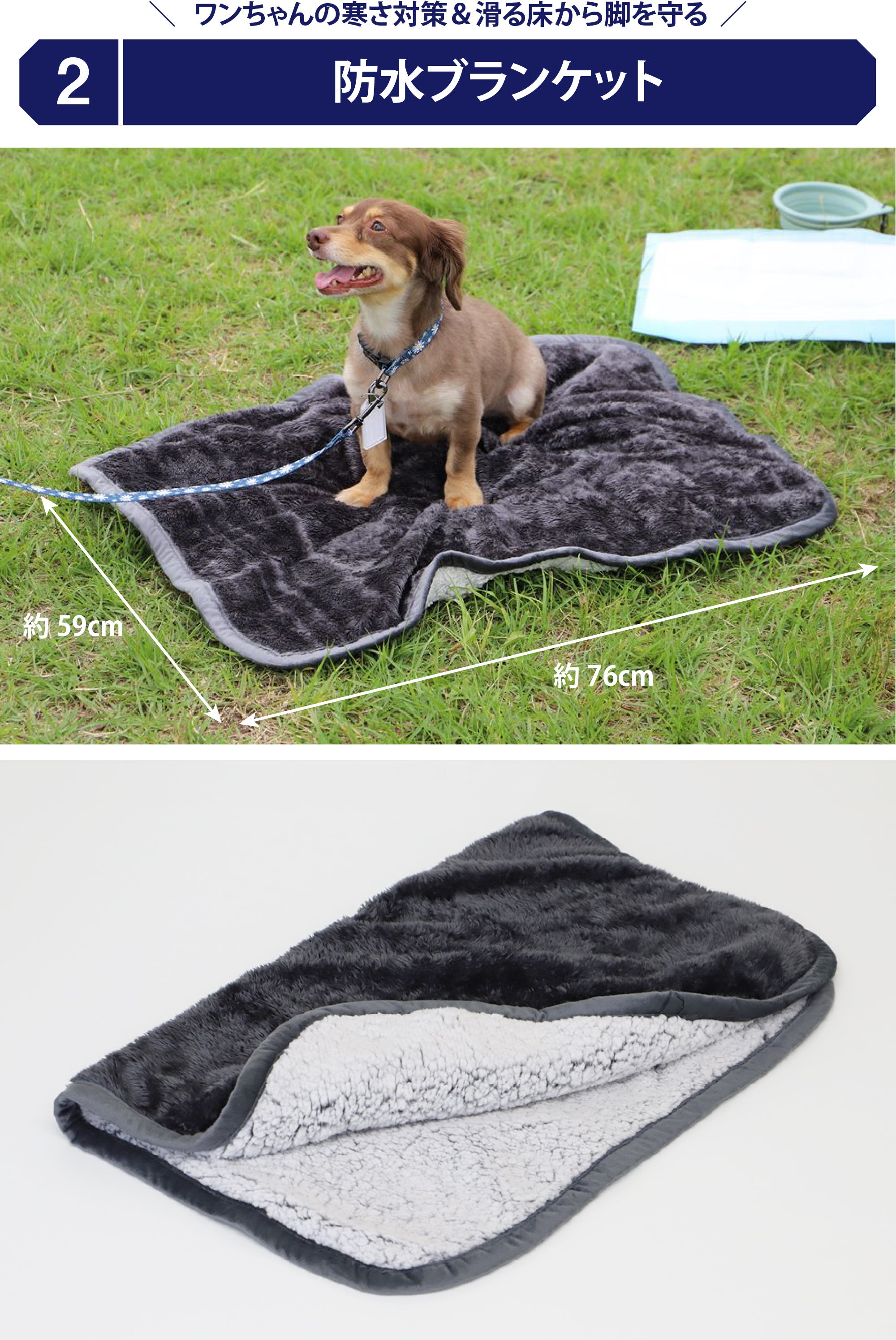 また、避難先での硬くツルツル滑るような床では脚を痛めてしまわないかが心配です。ワンちゃんに滑る床は大敵です。このブランケットを敷けば滑りを軽減できます。