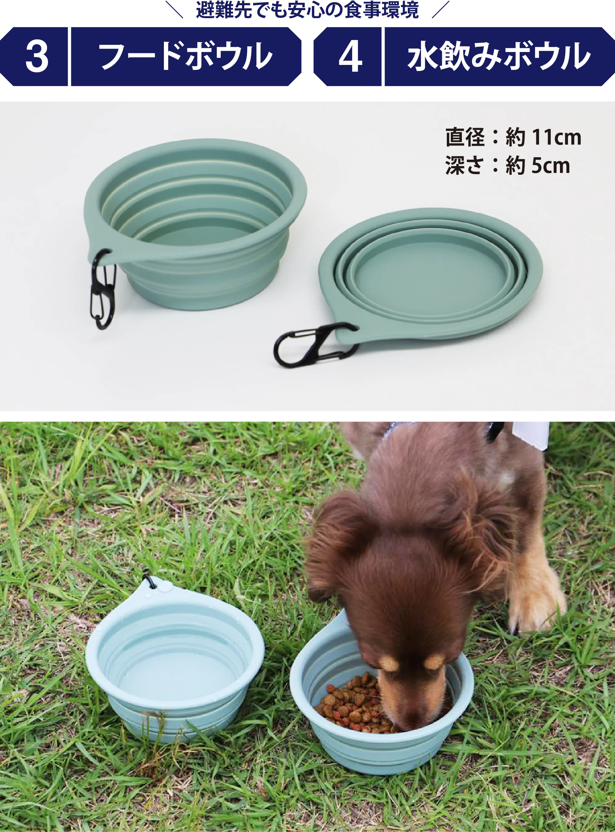 コンパクトに折り畳みができるボウルです。しまっておくときはとてもコンパクトになります。2つ入っておりますので、 片方はペットフード用、もう一方は水飲み用として使うことができます。シリコン素材で汚れも簡単に洗い流せるので清潔に使っていただけます。