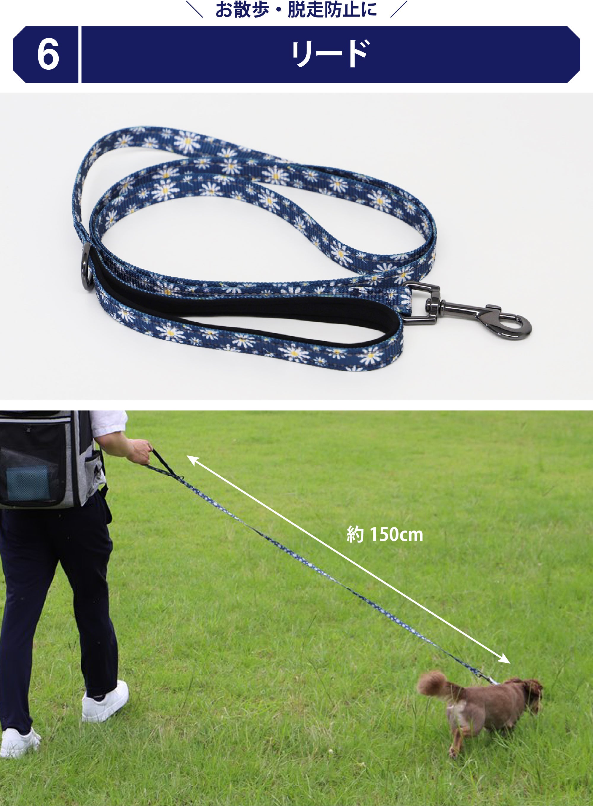首輪と同じ柄のリードです。全長約 150cm で長すぎず丁度良い長さです。