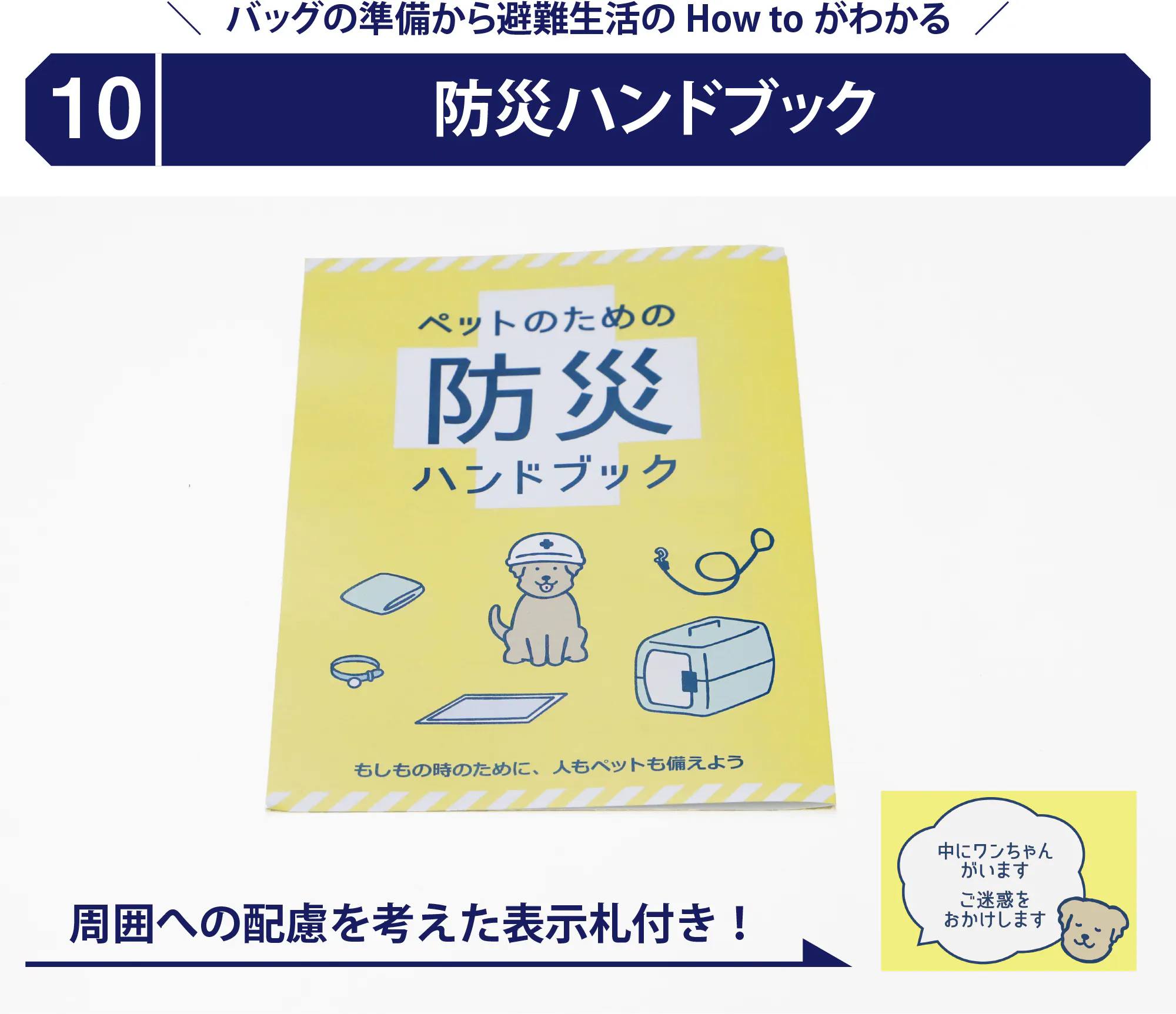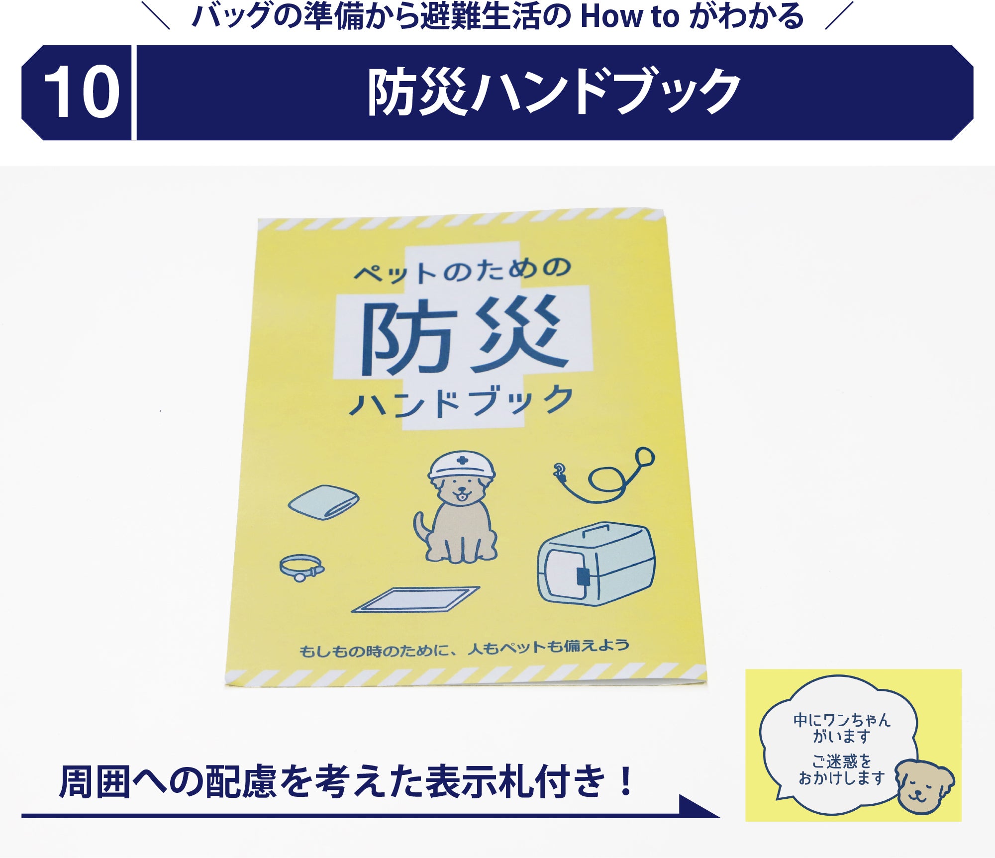防災セットが届いたらまずやっていただくこと、各付属品の使い方、ペットの避難や防災に関する情報が入ったハンドブックです。また、避難先での他の方への配慮としてリュックケージに掲げていただく表示札も同封しています。ハンドブックをお読みいただき、一緒に防災バッグに入れておいてください。