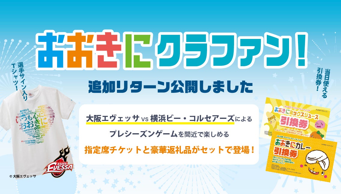 2024/08/19 12:00いつもおおきに!お待ちかねの【プレシーズンゲーム (9/8(日)inおおきにアリーナ舞洲)】に関する追加リターンを公開しました!大阪エヴェッサ vs 横浜ビー・コルセアーズ によるプレシーズンゲームを間近&豪華返礼品付きでもっと楽しむプランをご用意◎Aプラン「極!ペアシート」はここだけの限定販売の特別シートをご提供します!B・Cプランの「ペア(シングル)シート+Tシャツ」は大阪エヴェッサ選手の手描きサイン入りTシャツが付いてくる!おおきにミックスジュース引換券はおおきに祭開催中はもちろん、イベント終了後も・おおきにコーヒー御堂筋瓦町店・おおきにコーヒーアメリカ村店・大阪エヴェッサホームゲーム出店(おおきにコーヒー)上記の店舗で使用可能です♪※有効期限あり※おおきにカレー引換券はおおきに祭終了後はおおきにコーヒー御堂筋瓦町店のみでの 引換えが可能ですご用意可能な数には限りがございますのでお早めに!おおきに祭とプレシーズンゲームを最大限楽しむプランでこの夏一番の思い出を作りませんか?皆様のご支援を心よりお待ちしております! もっと見る
