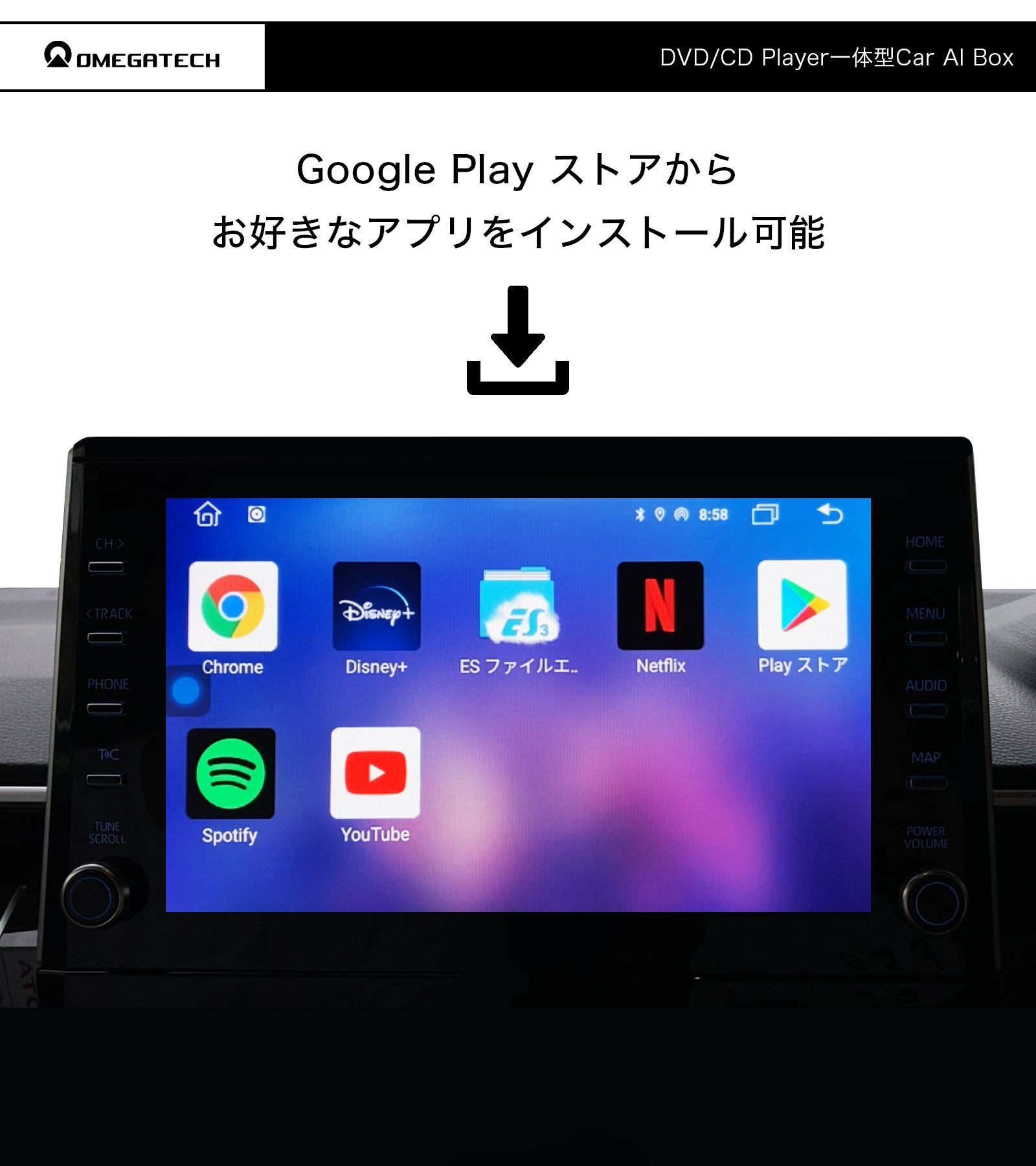 本製品は、CarPlay対応のディスプレイオーディオのUSB端子に本体を接続するだけで、Androidシステムが簡単に使えます。