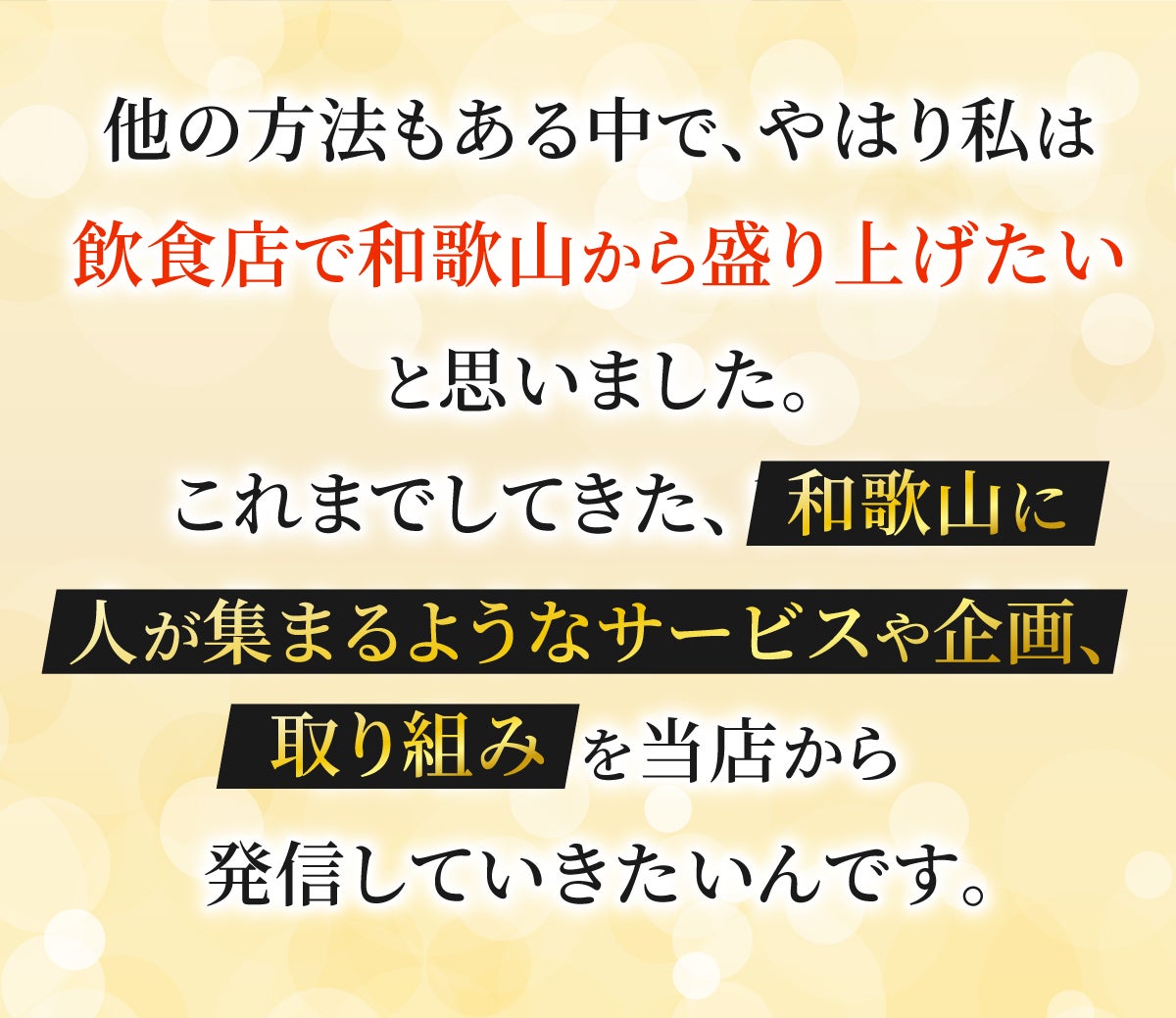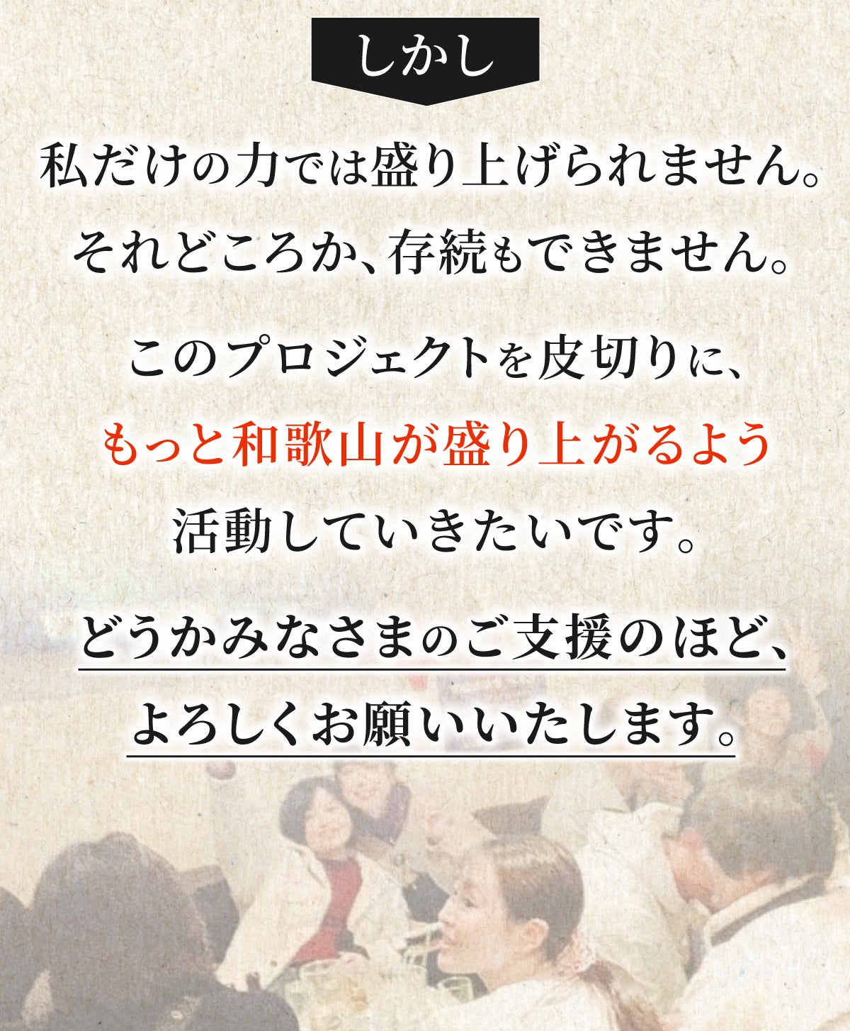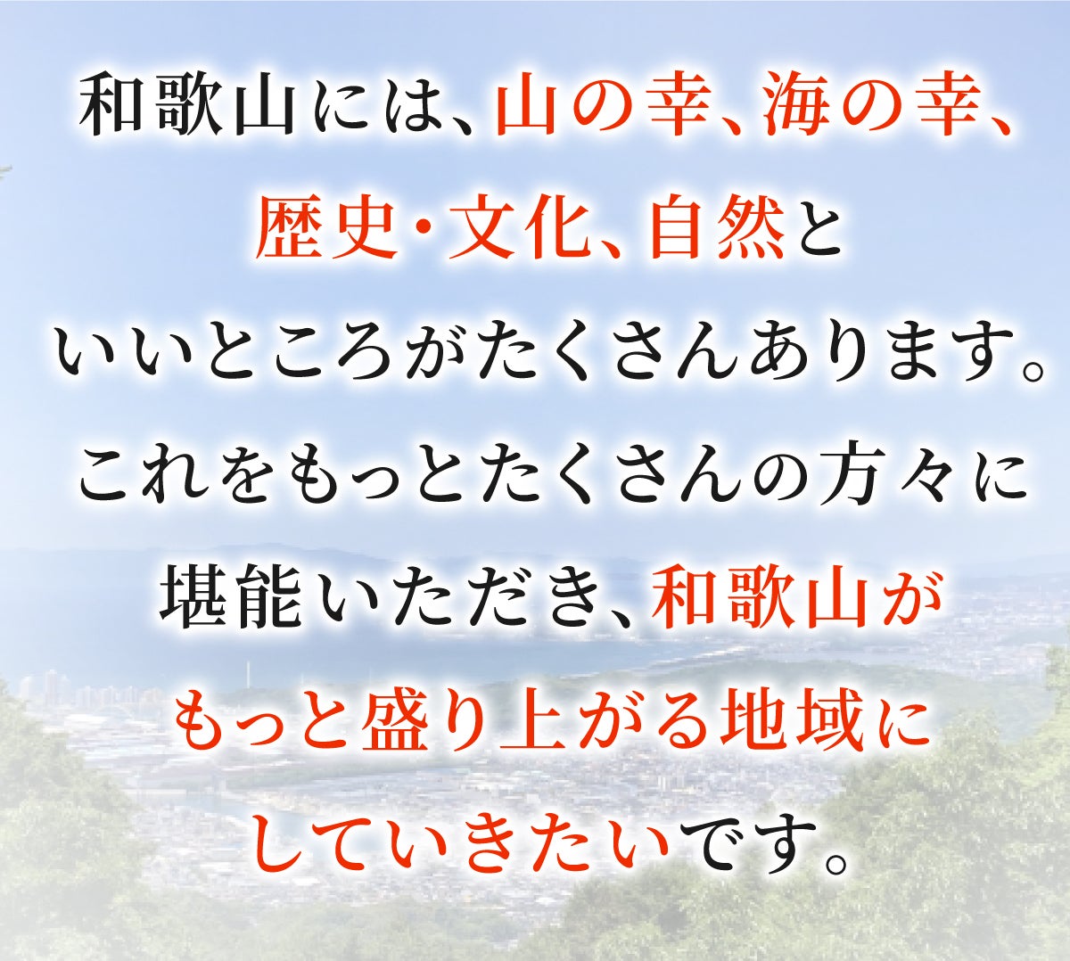 そこで、どうか皆さんの温かいご支援をいただき、皆さんとともに和歌山を盛り上げていきたいと思っています。