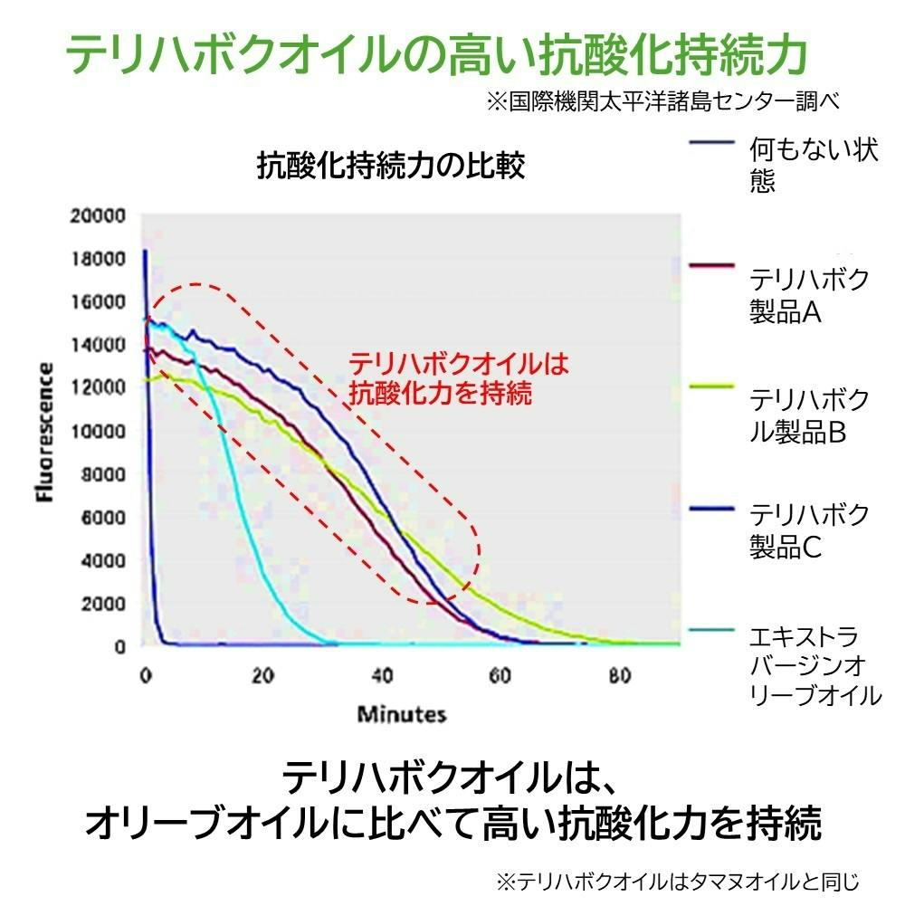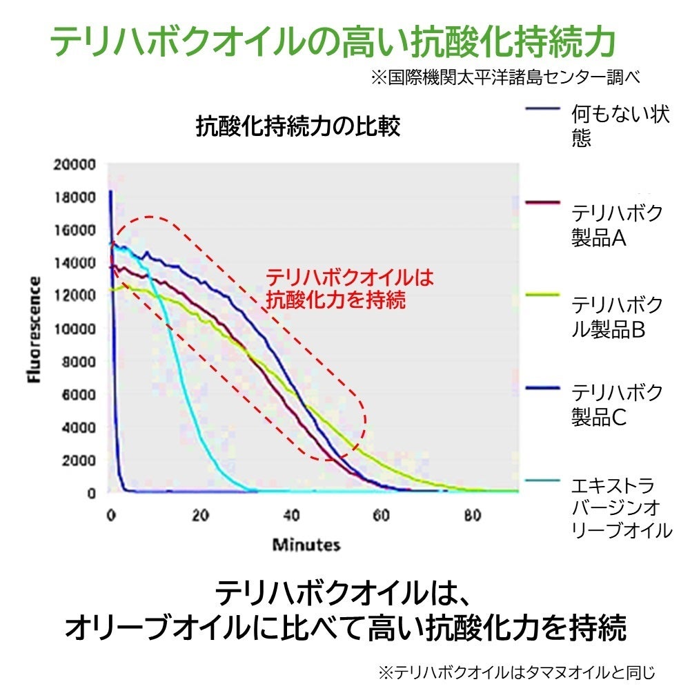太平洋の島の別々の生産者が生産したテリハボク(タマヌ)オイル製品を、市販のエキストラバージンオリーブオイルと比較してみました。3つのテリハボクオイル製品は、いずれも市販のエキストラバージンオリーブオイルに比べて高い抗酸化力を持続させている結果が得られました。 ※国際機関太平洋諸島センター調べ