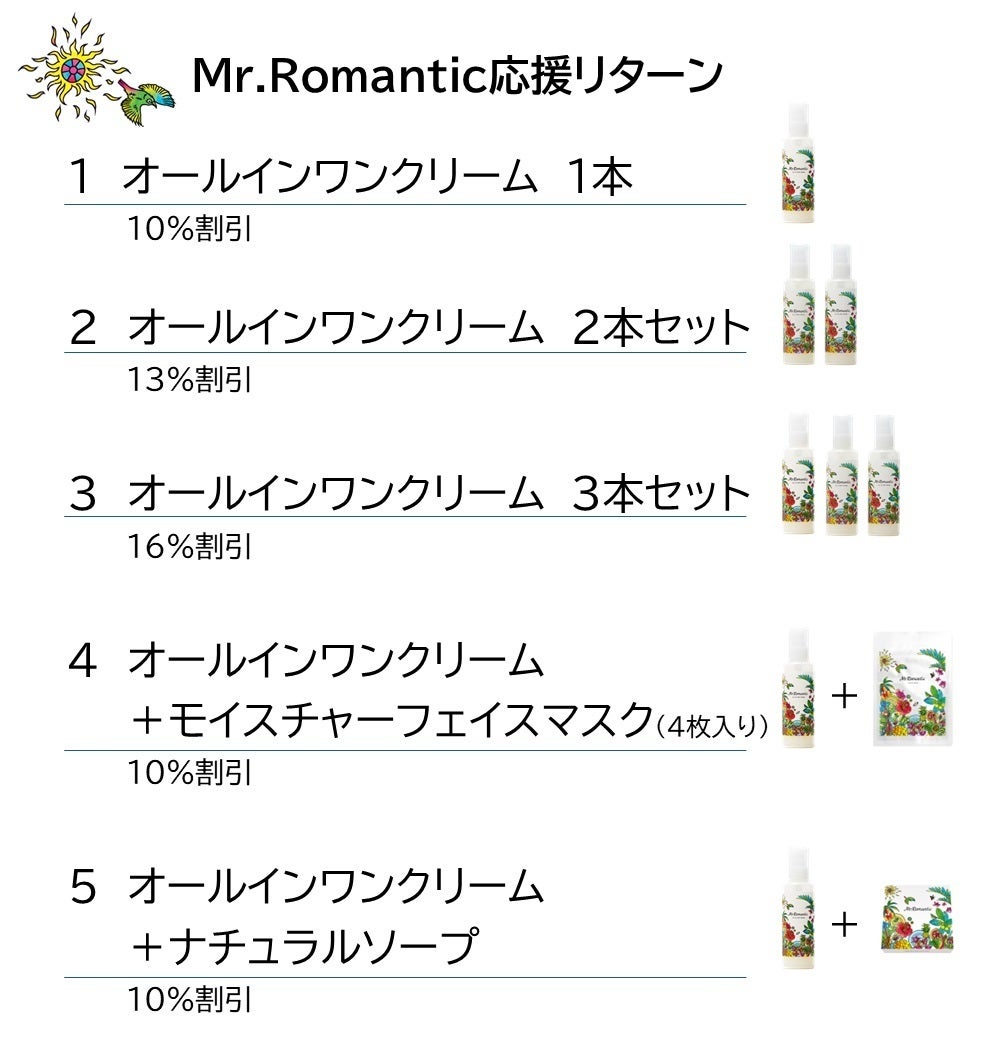 クラウドファンディングでは、オールインワンクリームに加えMr.Romanticラインナップをお得な価格でお届けします。